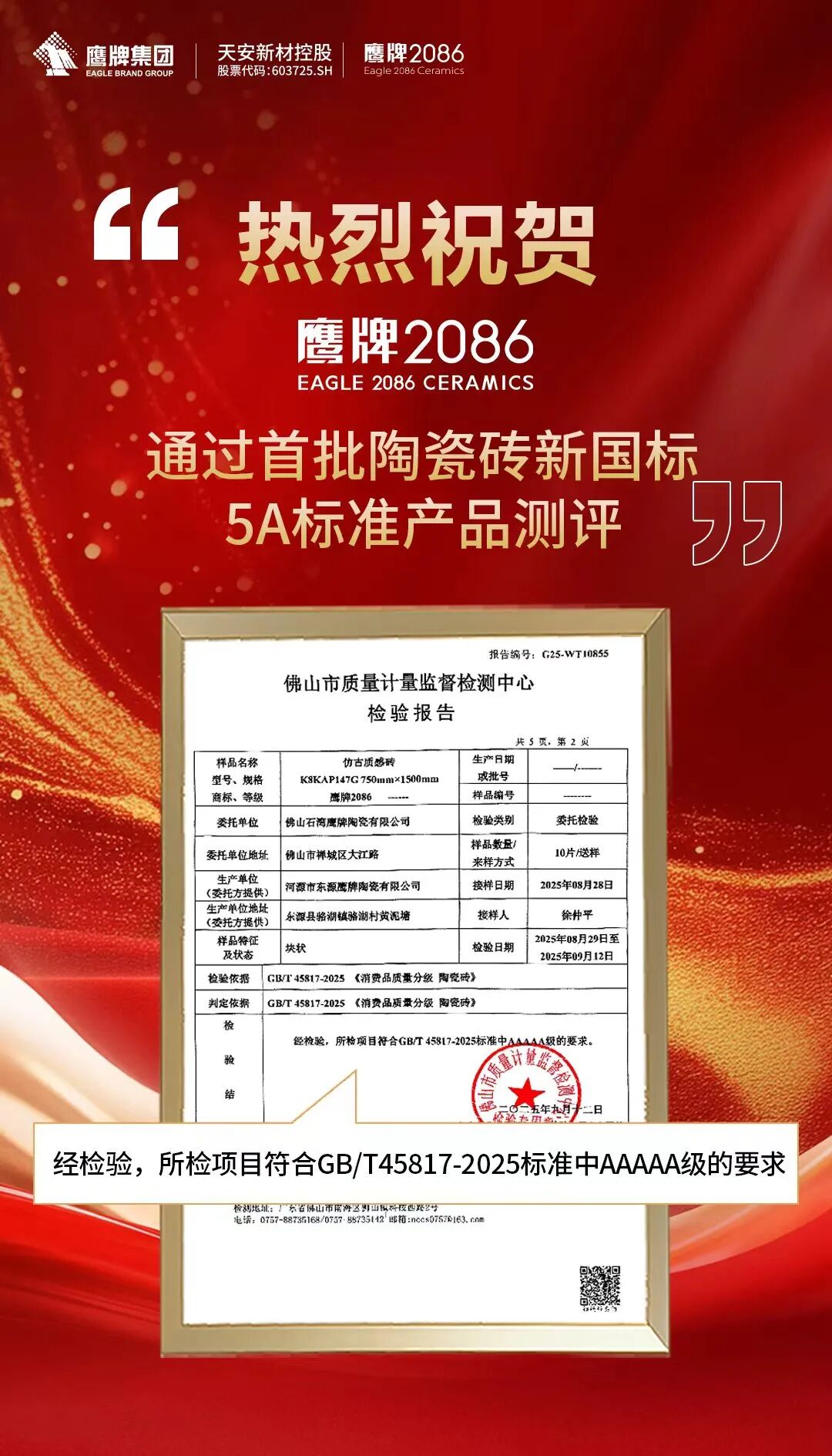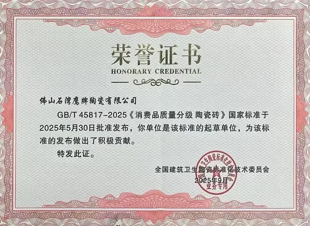 作为陶瓷行业的领军品牌,鹰牌2086送检产品在“2025建筑陶瓷新质生产力发展大会”上率先通过新国标5A(AAAAA)标准产品检测,成为业内首批获此权威认可的企业之一。
