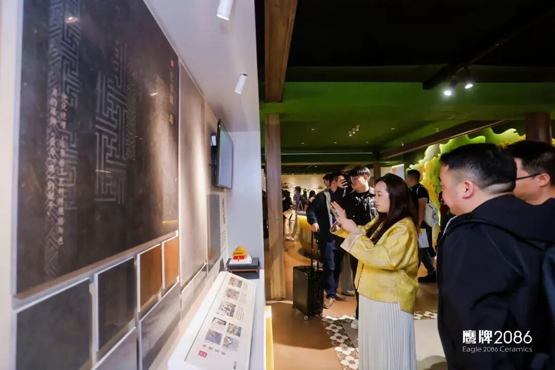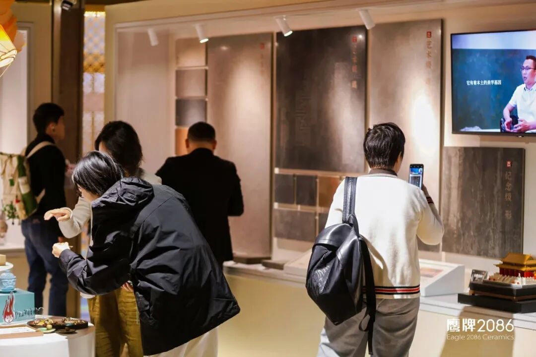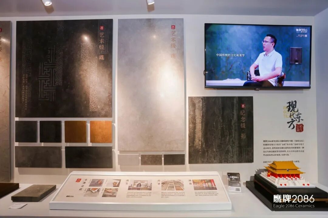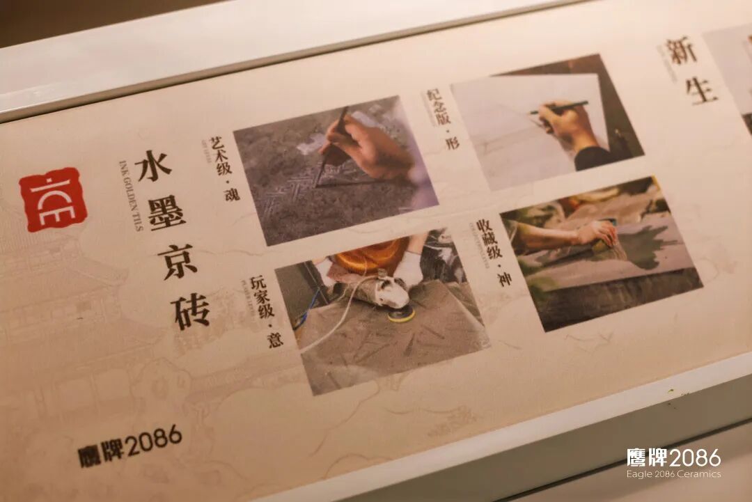 水墨京砖:源自故宫三大殿铺设的古法金砖,本次展示了鹰牌2086对古法金砖的十年深耕历程,水墨京砖四代产品也在此完整呈现。