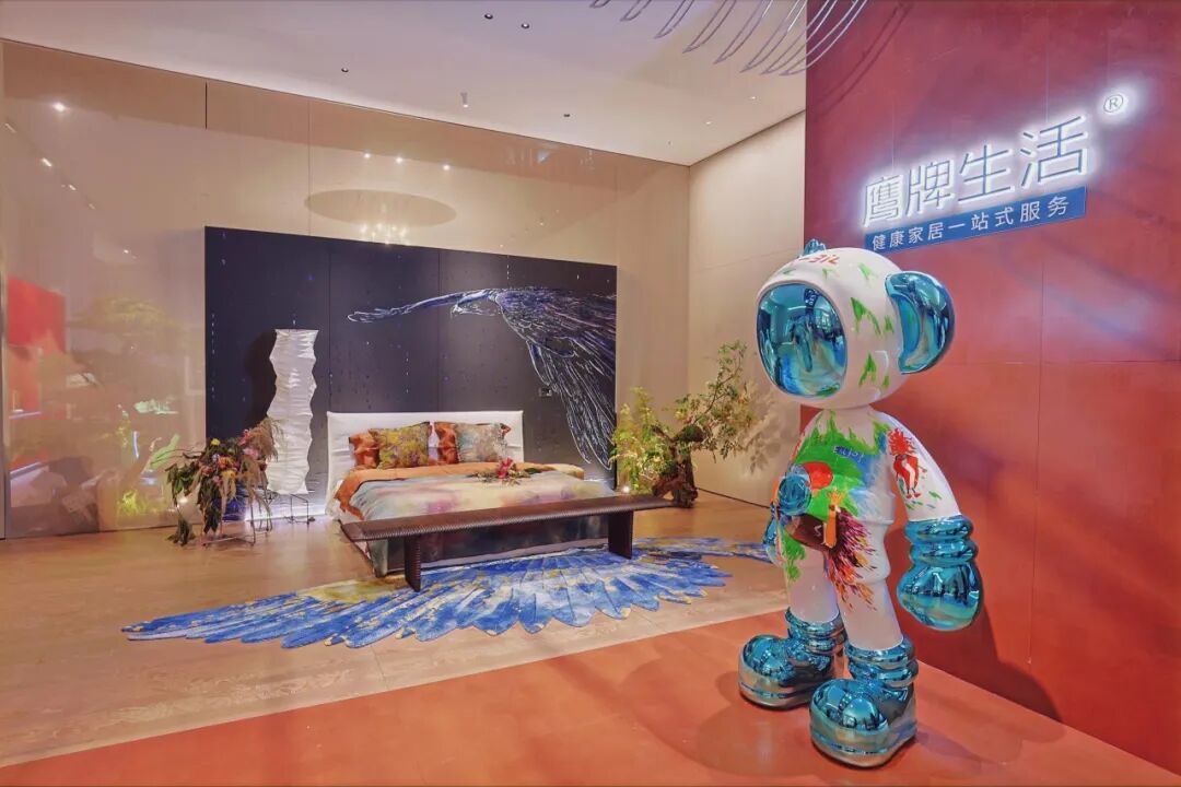 在奢华居所「主寝翱境」概念空间中,覃思以“境域式设计”注入“鹰之翱翔”的精神意象,鹰牌生活与鹰牌2086联合融入岭南文化、刺绣美学与健康科技,最终呈现出一个可完整交付的理想生活场景。