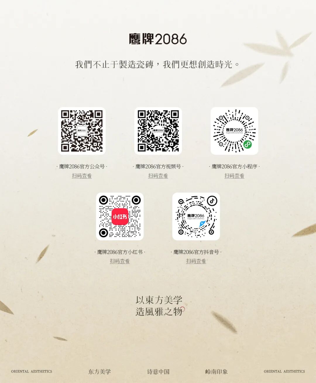 更值得期待的是,今年鹰牌2086已完成品牌升级基础工作,以“现代东方”设计语言为核心的新总部展厅将于明年落成开业,届时将以全新的形象与场景,为行业和消费者带来一场陶瓷+大家居的现代东方美学盛宴,敬请期待!