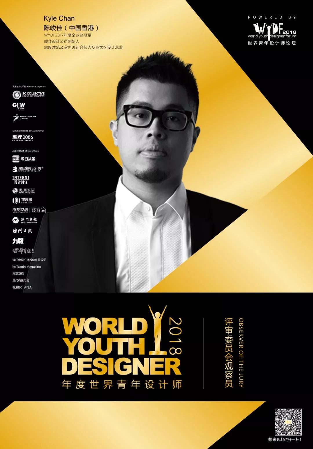 WYDF2017年度全球总冠军、峻佳设计创始人、思度建筑及室内设计合伙人及亚太区设计总监陈峻佳(Kyle Chan)将作为评审委员会观察员出席本次WYDF2018年度青年设计师评选总决赛。