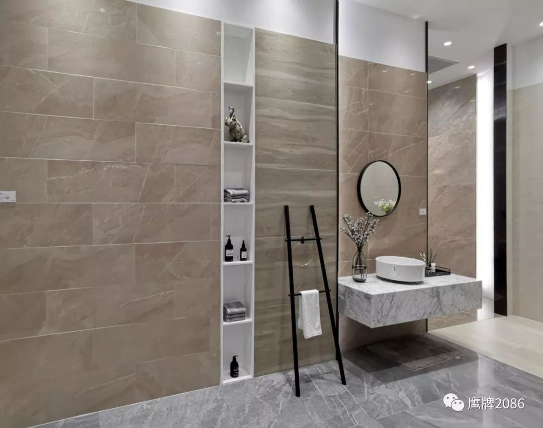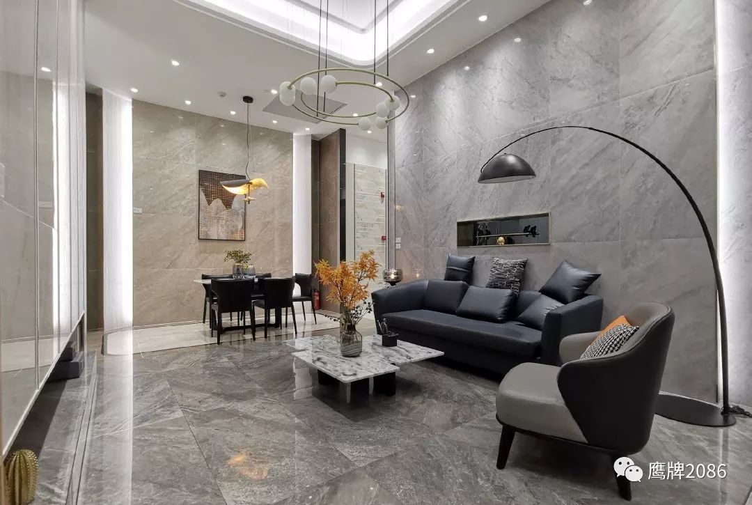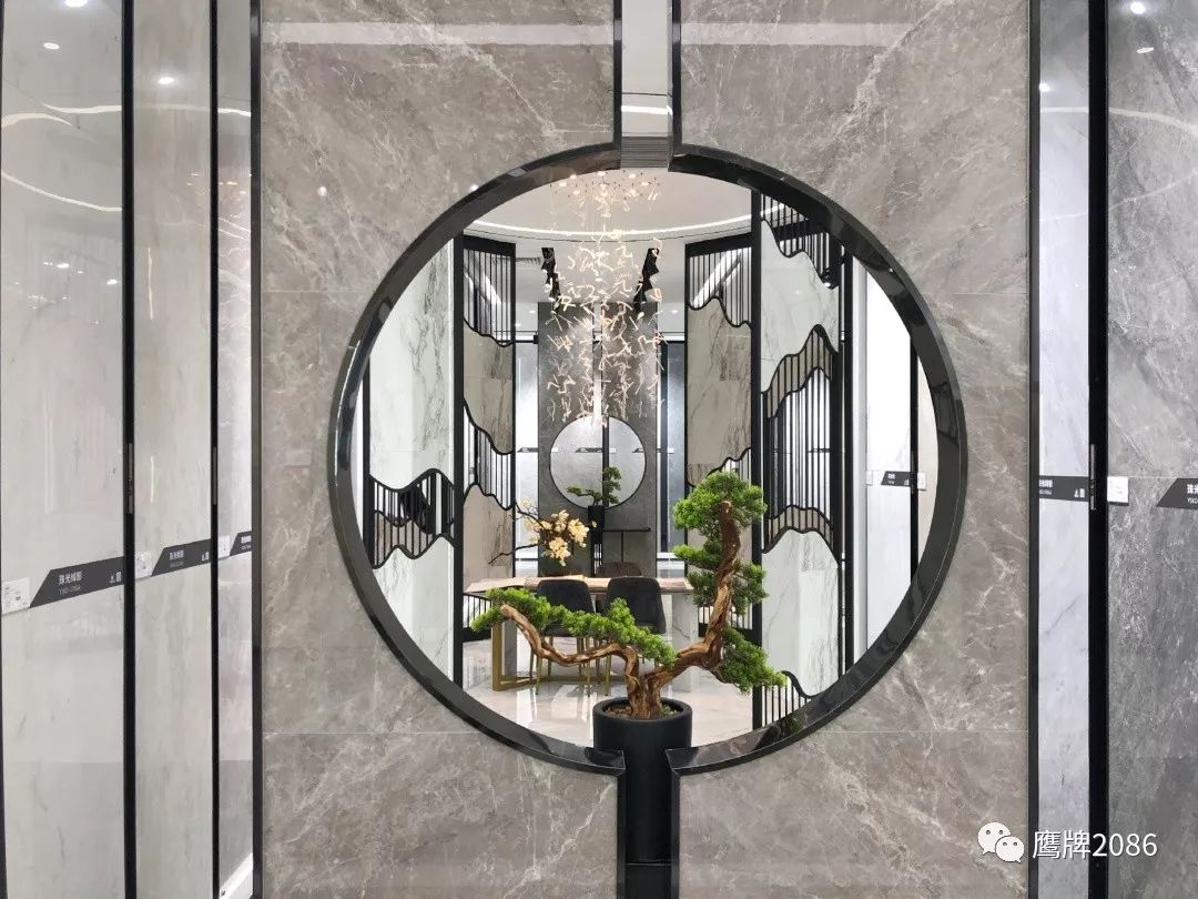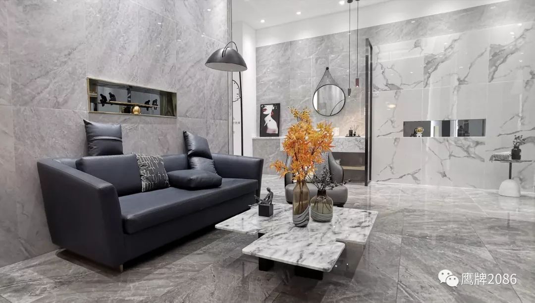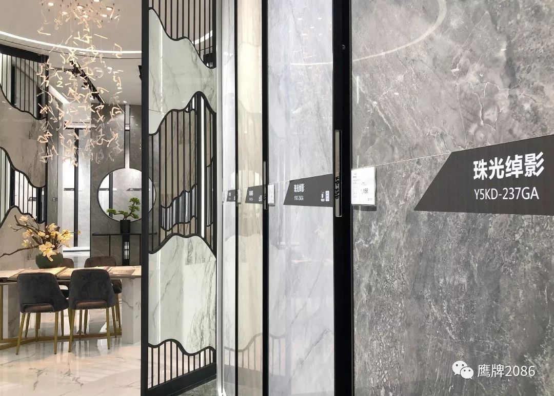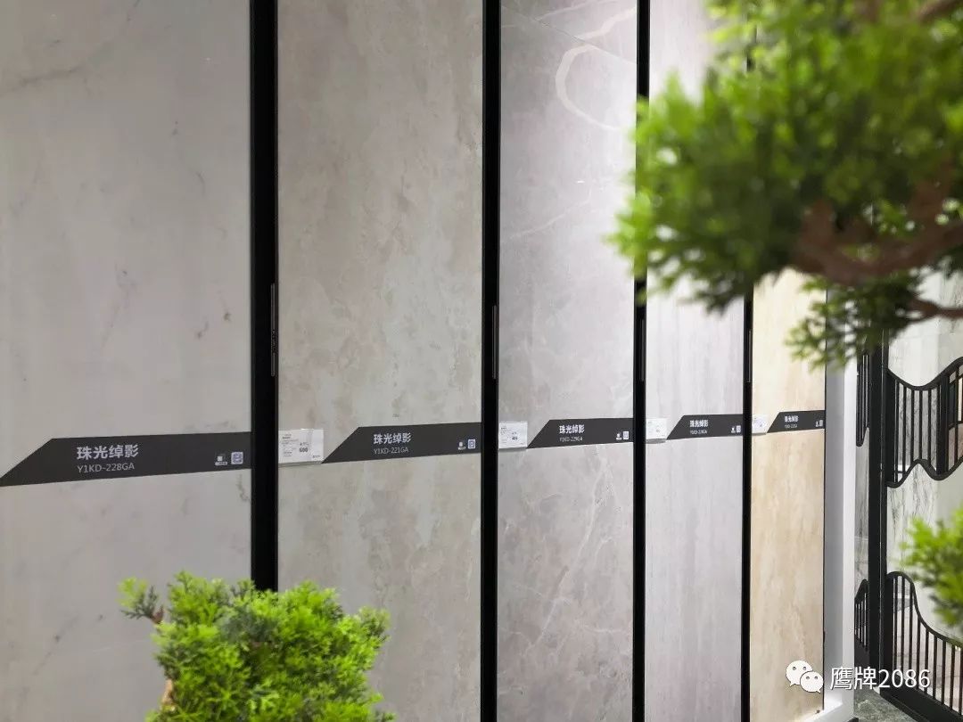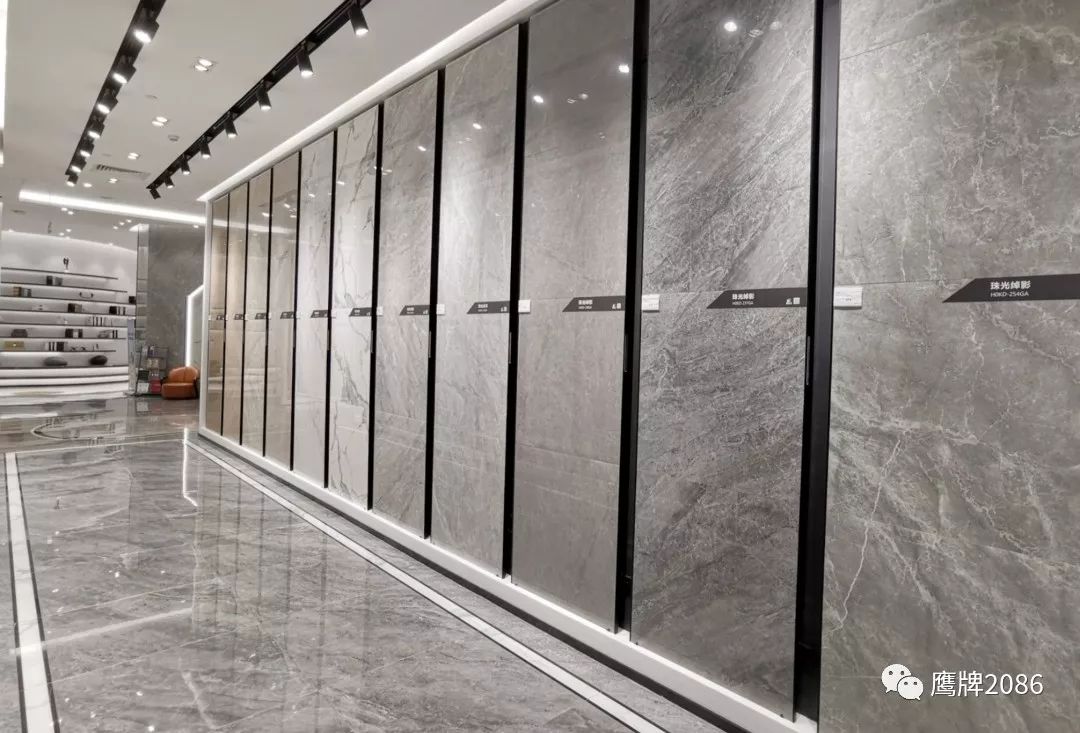震撼的选材区设计,融合鹰牌2086与鹰牌陶瓷两大品牌,总计上千款产品,直板到顶的产品展示,冷暖色系的渐变排列,视觉舒适又具有震撼力,总有一款适合你。