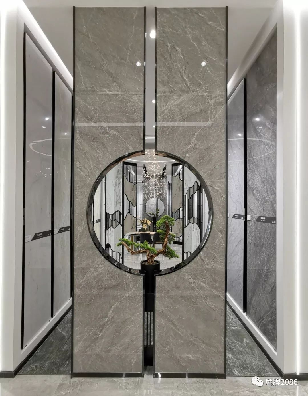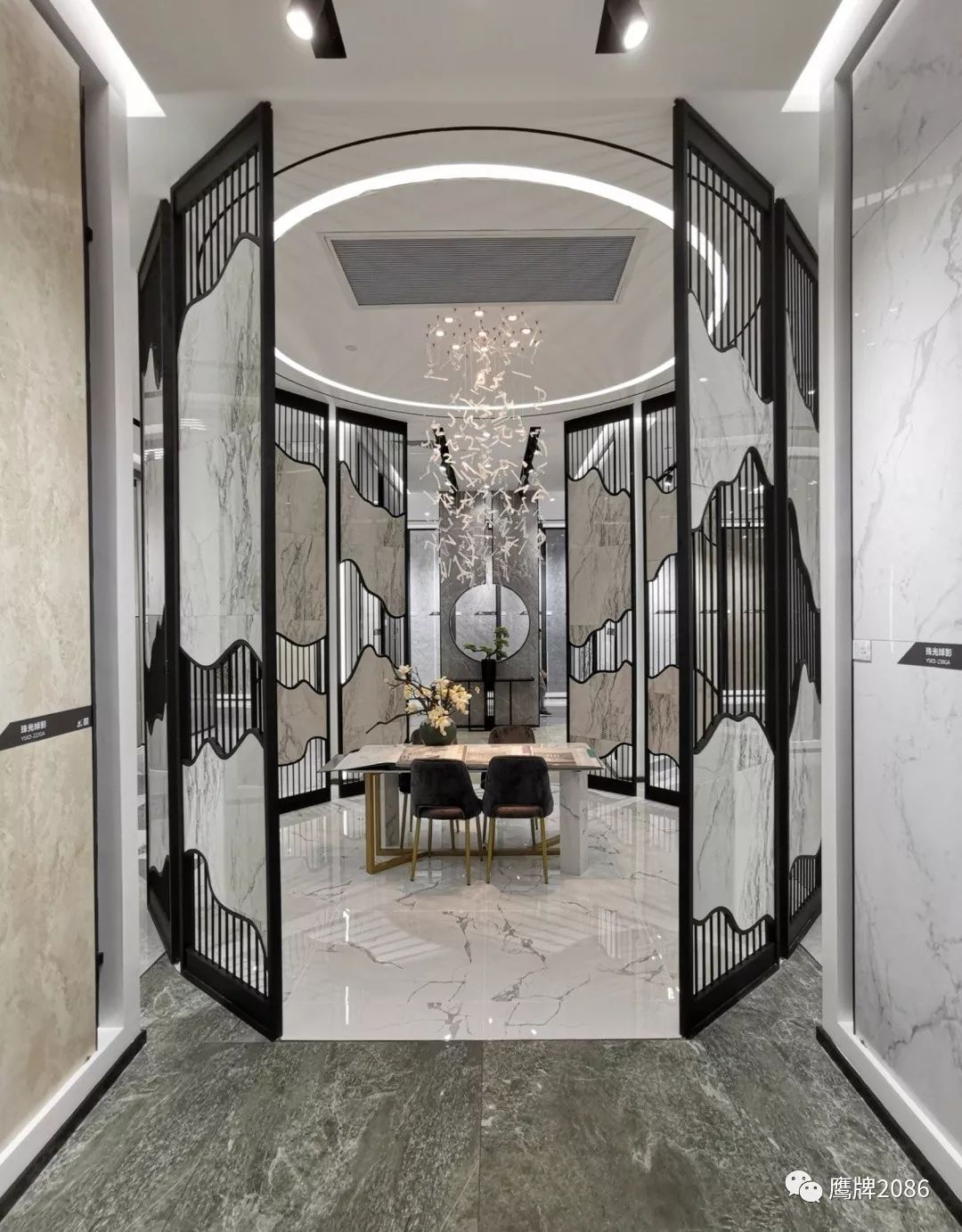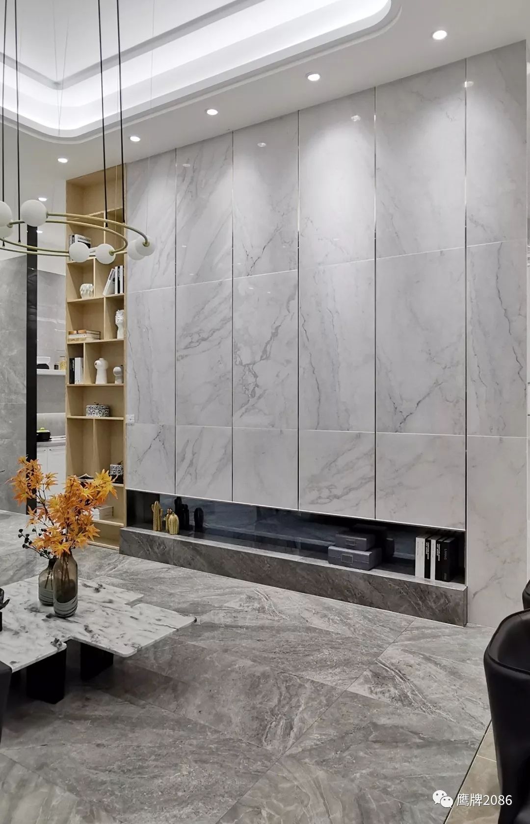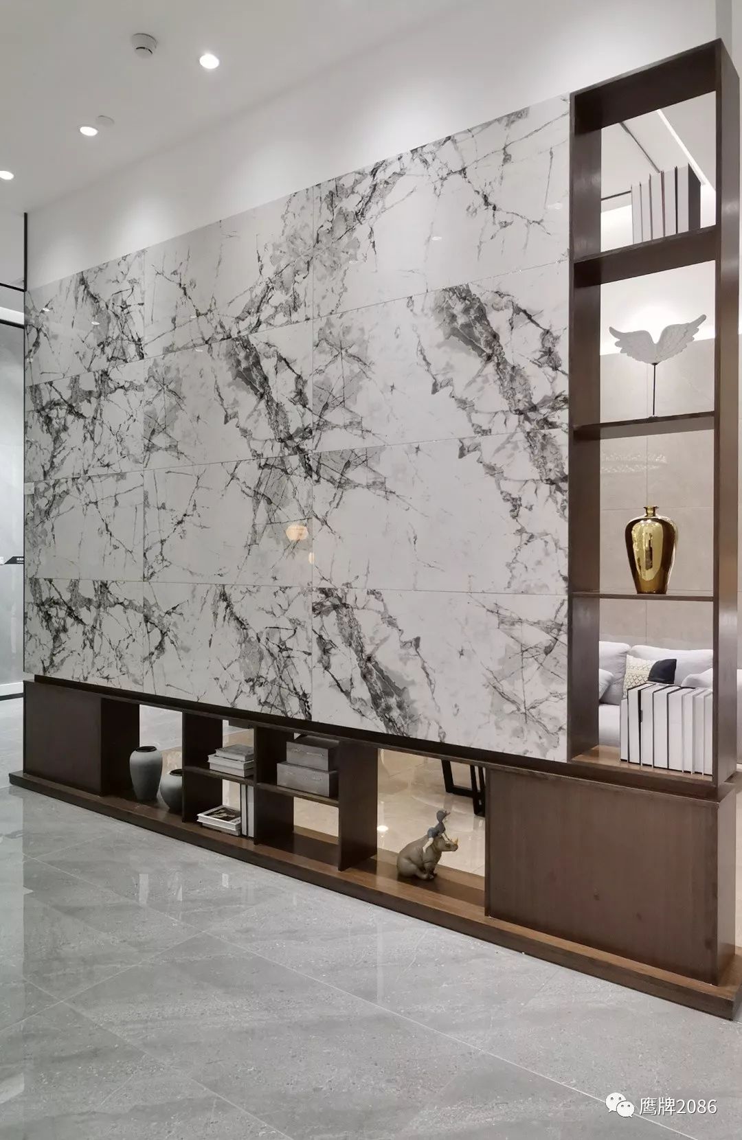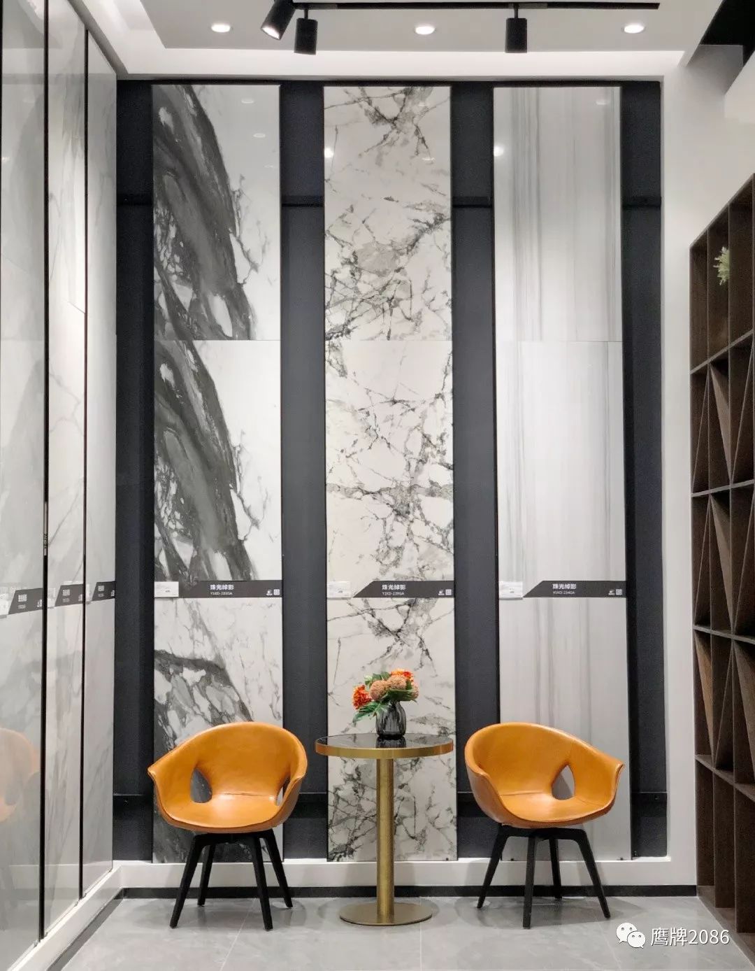 震撼的选材区设计,融合鹰牌2086与鹰牌陶瓷两大品牌,总计上千款产品,直板到顶的产品展示,冷暖色系的渐变排列,视觉舒适又具有震撼力,总有一款适合你。