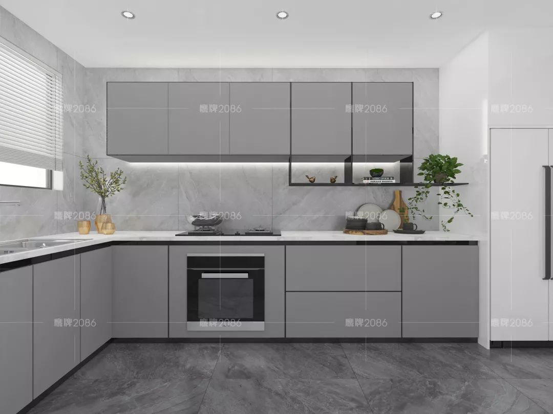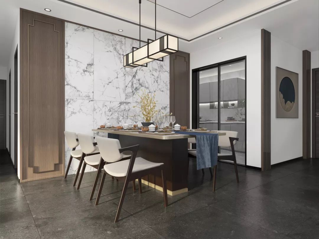 生活的返璞归真并非来自外在巧饰,没有多余的色彩,没有繁琐的摆设,水墨京砖与寒江雪营造的古典新中式餐厅,和现代简约高级灰的厨房对比,呈现年代的跨越感却没有打破空间的整体性,是对新中式最好的诠释。
