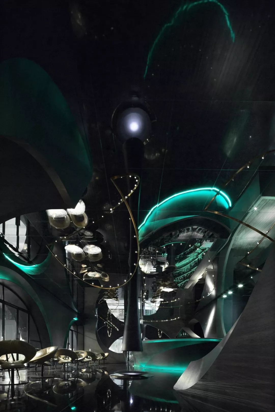 铜柱承载着琉璃羽毛,掘地而起直冲天际;在天花镜面的倒影下,仿佛穿越时光的对话。墙面的镜面又在横向维度上把空间扩大了一倍,如此让整个空间像羽翼般的梦境一样无界。我们希望客人能够感受到置身在梦境之中,扑朔迷离,形成独特的空间感受。