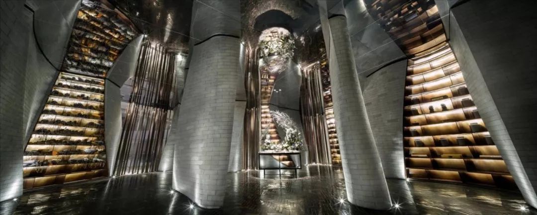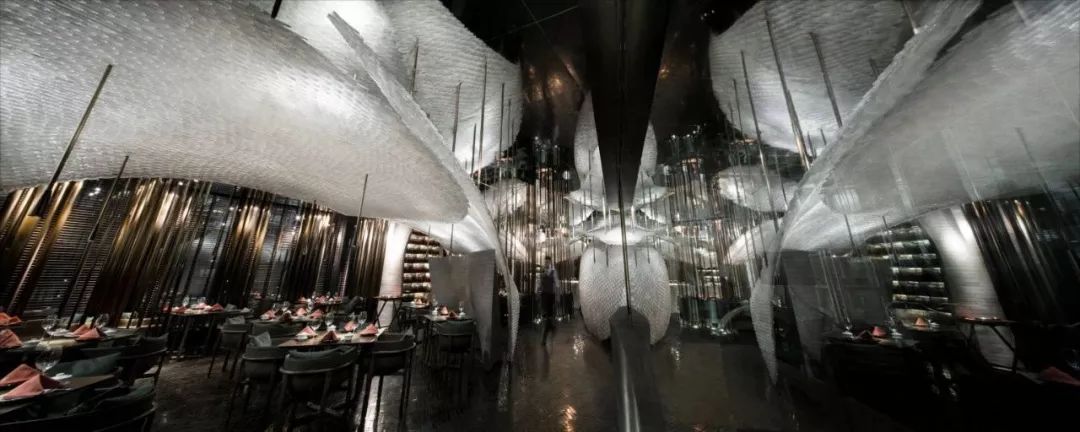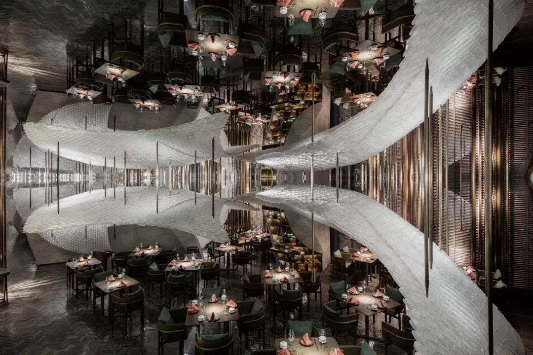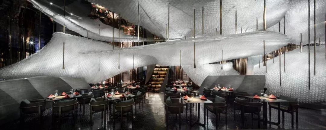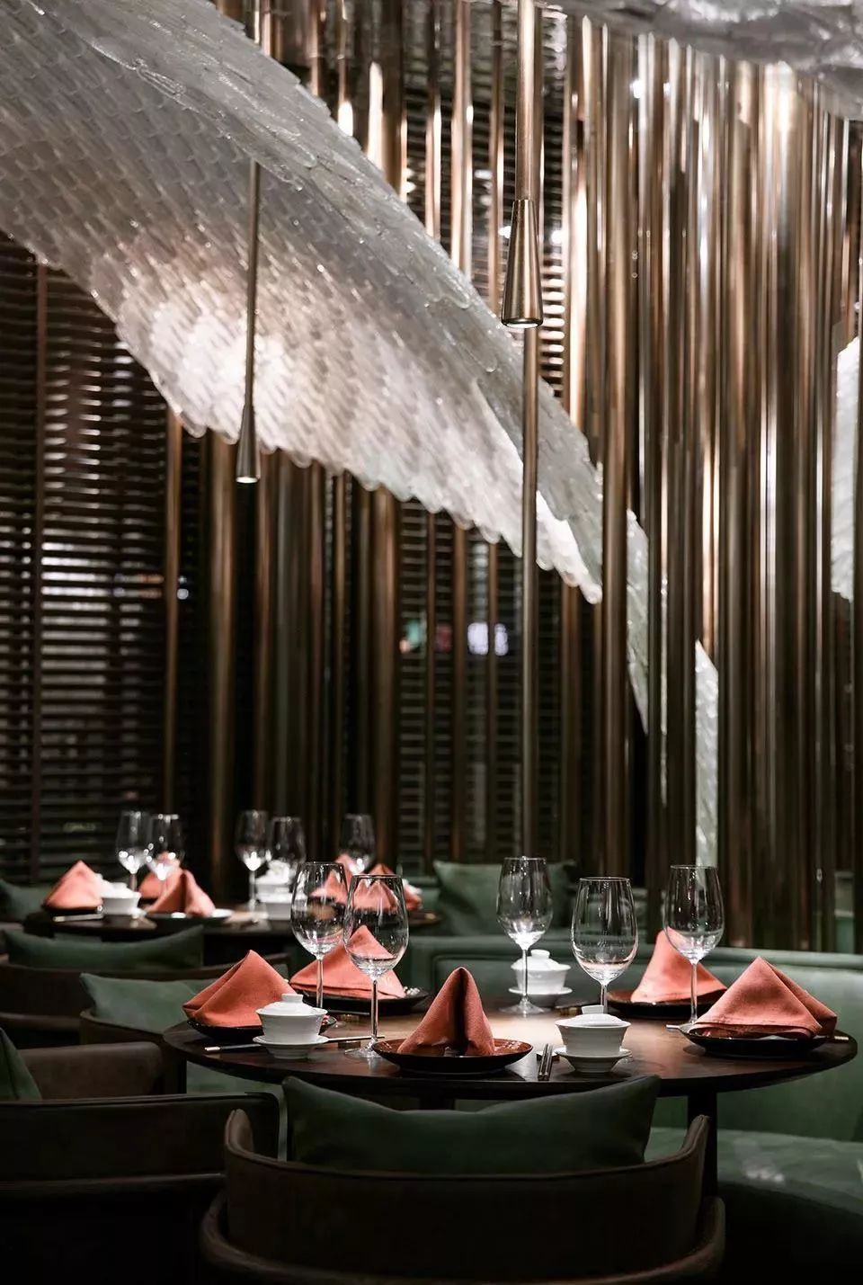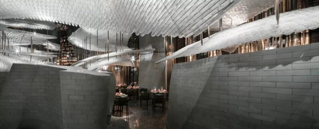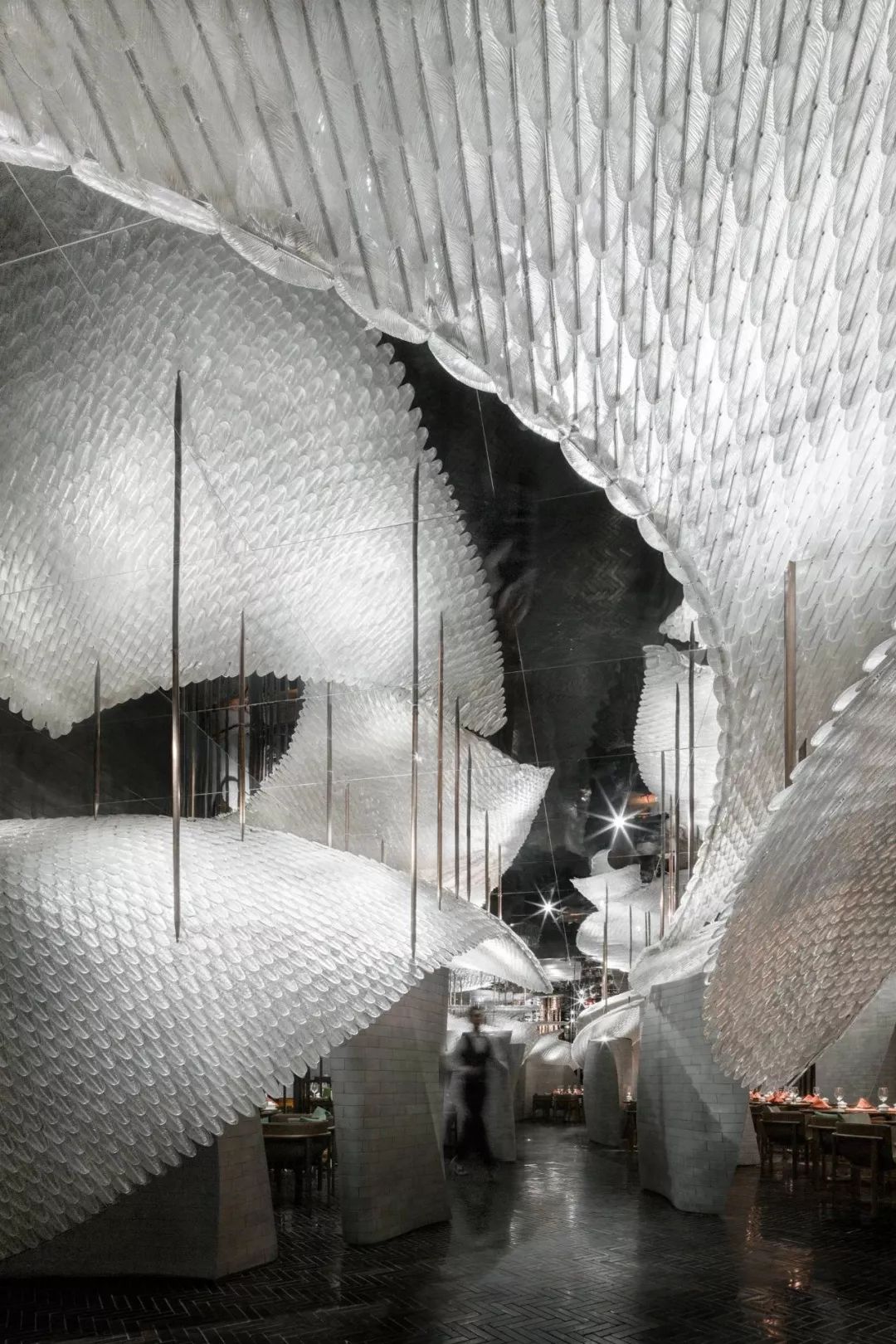 我们在设计这个宋·川菜的时候就想,能不能改变大众对川菜馆的固化思维,就是把接地气、大众化、热闹的东西做成高端的、体验感强的,所以最终才有了这个用40万块琉璃羽毛、10万块异形不锈钢砖构筑的中式餐厅。开放式厨房促进交流,游走动线注重体验,还有浮雕砖的文化表现,都是经得起推敲的细节,也是一个独立思考的表达。