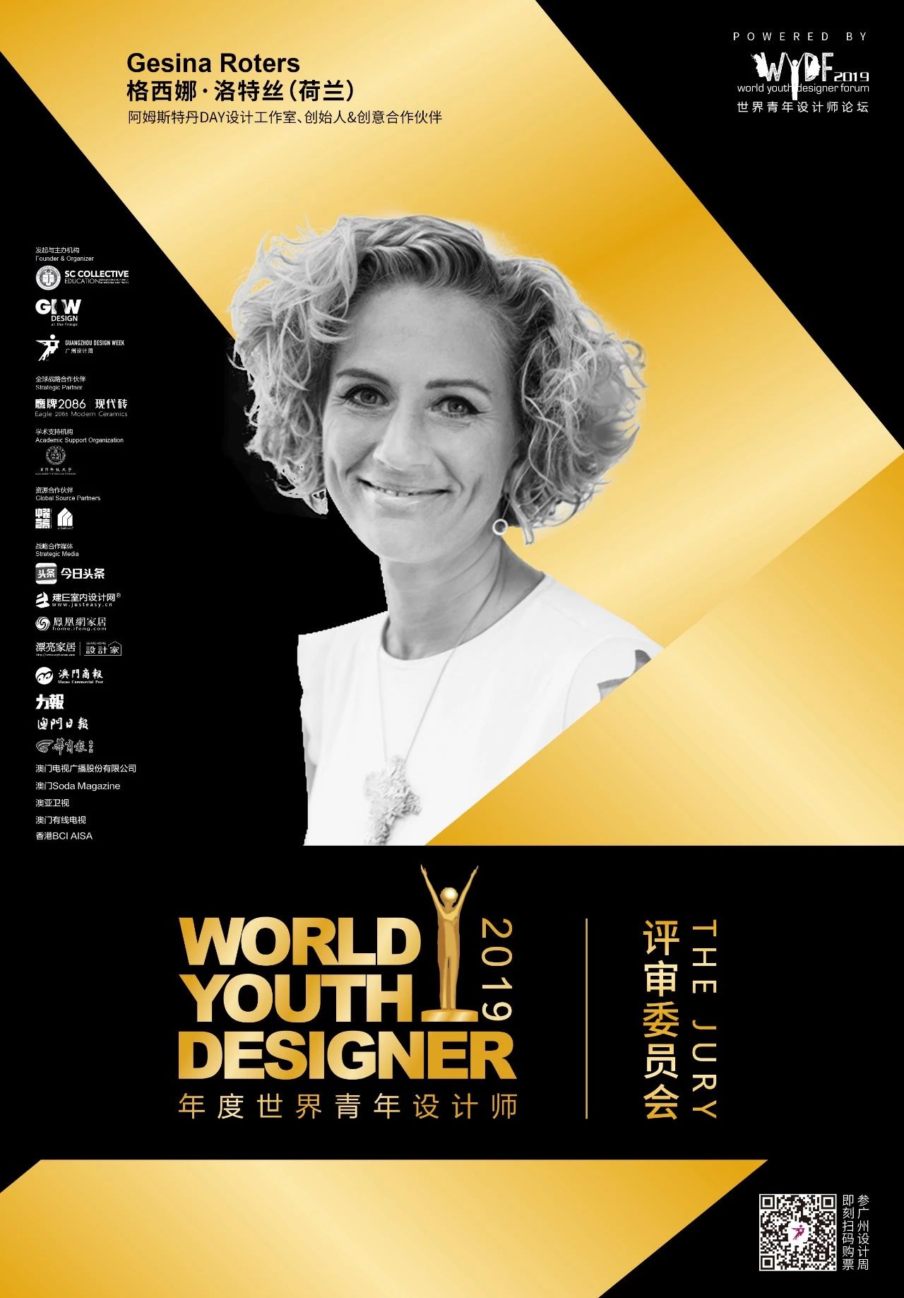 Gesina Roters女士是阿姆斯特丹DAY设计工作室的创始人以及创意合作伙伴,也是戛纳国际设计节评委和Eurobest奖、荷兰设计奖等多项国际赛事的评委会主席。设计上她专注于定义深层次的叙述,创建强大的品牌体验,同时,在评判创意工作和选拔人才方面,她也经验丰富并且乐在其中。她的作品遍布全球,最知名的例如可口可乐、耐克、埃因霍芬机场、梵高博物馆和阿布扎比码头等等。她曾荣获多项国际奖项,包括荷兰设计奖和红点奖等。