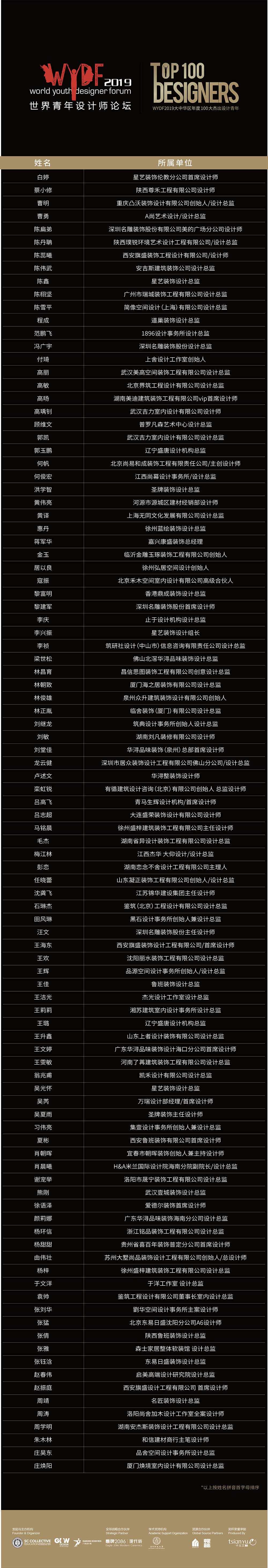 至此,“WYDF2019大中华区年度100大杰出设计青年” 评选圆满落幕,再次恭喜以上出类拔萃的青年设计领袖成为“WYDF2019大中华区年度100大杰出设计青年”上榜人物。近期我们还将陆续公布“WYDF2019大中华区年度室内设计金奖”获奖名单,请持续关注!
