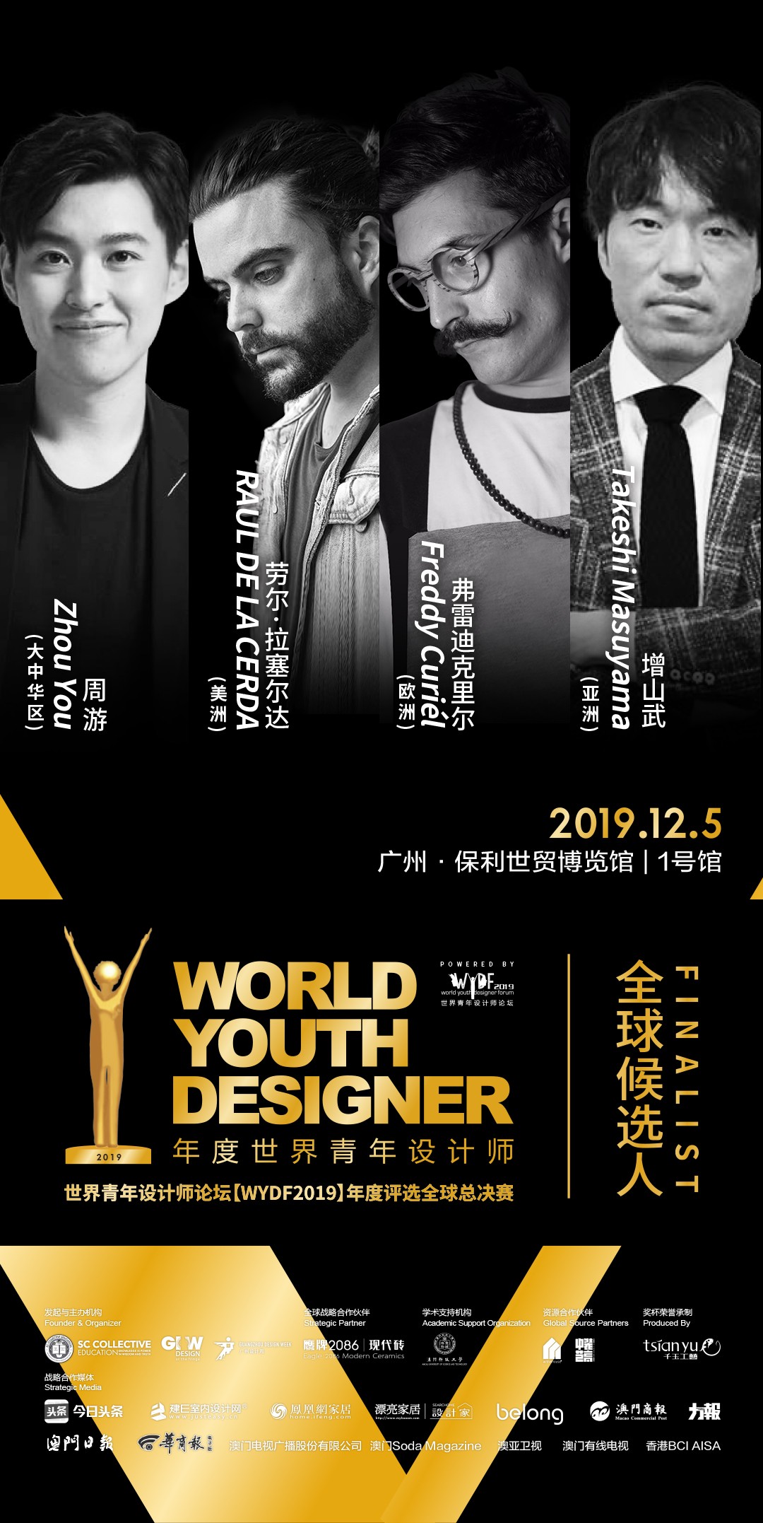 “WYDF2019大中华区年度100大杰出设计青年颁奖盛典”将在12月5日下午于广州保利世贸博览馆1号馆举办,现场除了重磅表彰本年度100位获奖设计师,同期将举办WYDF2019年度评选全球总决赛,来自欧洲、亚洲、美洲、大中华区的四位优秀青年设计师代表将同台竞技,更有国际大咖评审现场坐镇和投票,共同见证“年度世界青年设计师”总冠军的诞生,打造青年设计师年度盛典!敬请期待!