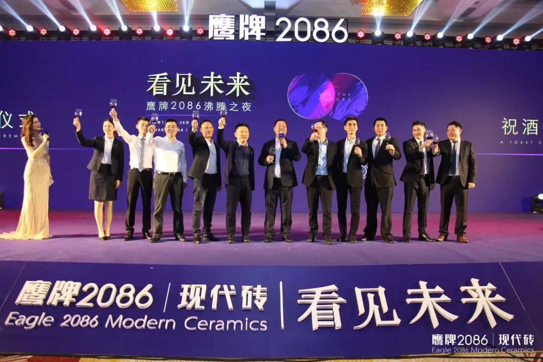 晚宴伊始,广东鹰牌陶瓷集团总裁林伟在热情欢呼声中致辞,除了对鹰牌2086经销商家人们热情欢迎之外,更多的是感谢,感谢经销商家人们的信任和支持,成就了一个展翅高飞的鹰牌2086。随后,林总邀请鹰牌集团众多领导上台一起祝酒,祝愿鹰牌2086拥有美好未来!