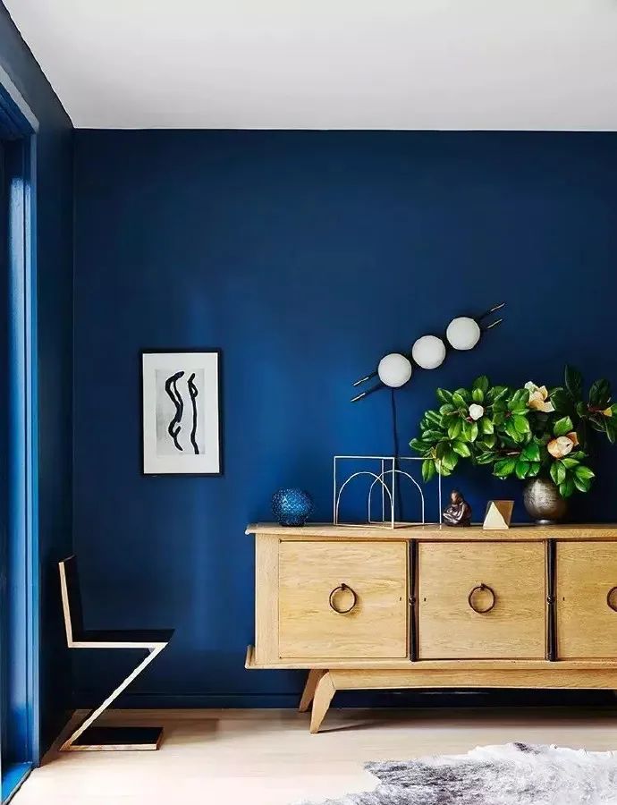 大面积的蓝,搭配明亮的白色或原木色家具,中和整体色调,同样能带给室内空间轻松的氛围,像是没有侵略性,卸下防备的互动,调动起乐观开朗的生活态度。