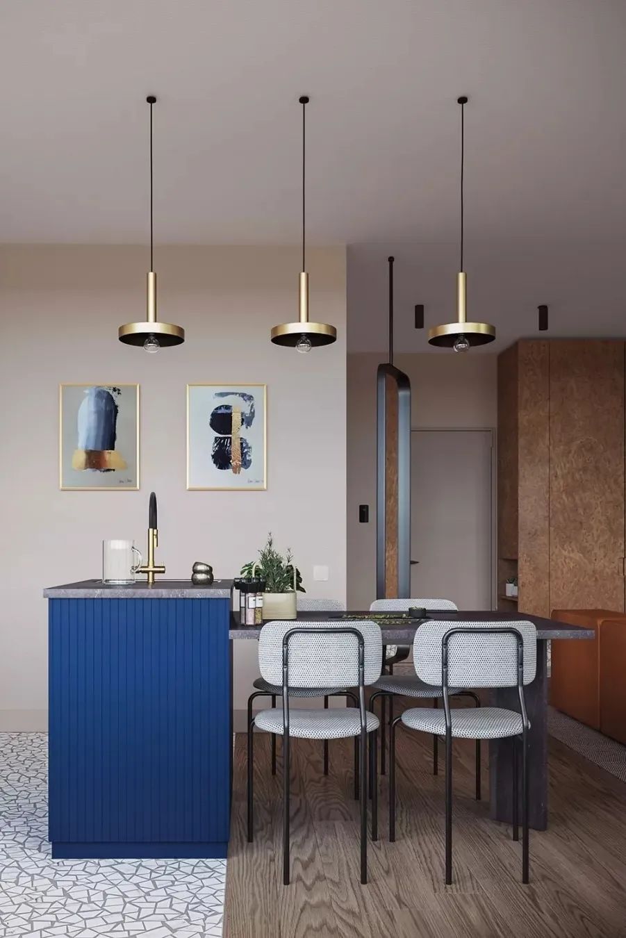 若觉得大面积的蓝色太过冷清单调,不妨把蓝色转移到家居单品上,沙发、橱柜、茶几、装饰画等等,轻轻点缀也能带来更多活力。