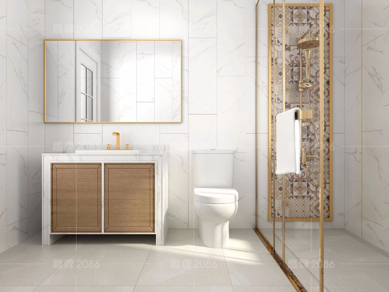 玻璃和金属是轻奢风格中最具特色的设计元素,局部点缀一些闪亮的元素更能表现奢华主义,尤其是玫瑰金的使用,使得设计更具个性化和层次感。夸张的水墨瓷砖背景墙,打破空间的单调,提高空间的视觉感和艺术观赏性。