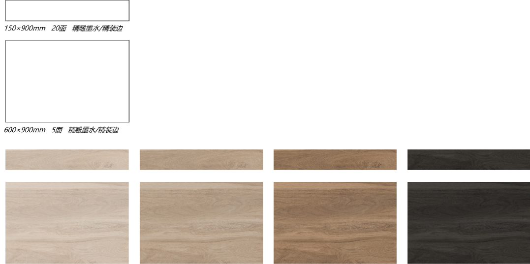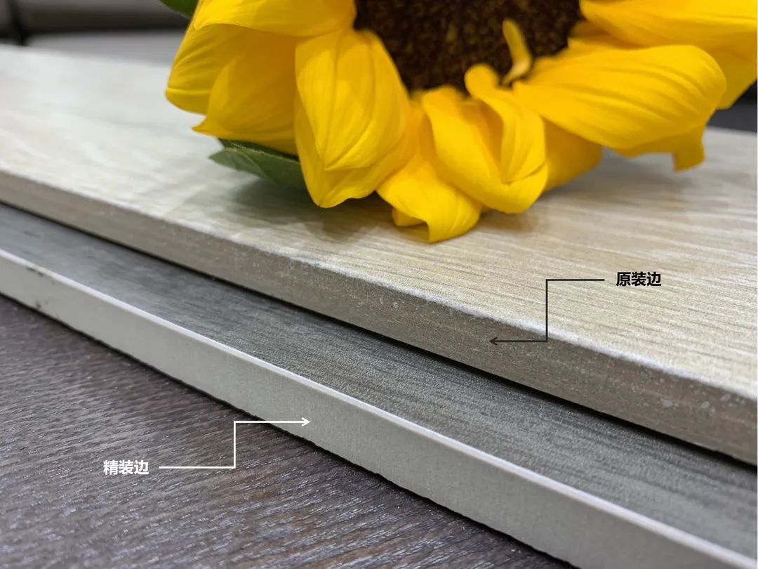 精装边 | 以方砖作为原始规格,经过切割、自动磨边、倒边等加工工序后,生产出的各种标准产品。精装边可以根据空间需求做进一步的艺术创作:水刀切割、雕刻、腐蚀、描金等等,用木纹艺术点缀空间。