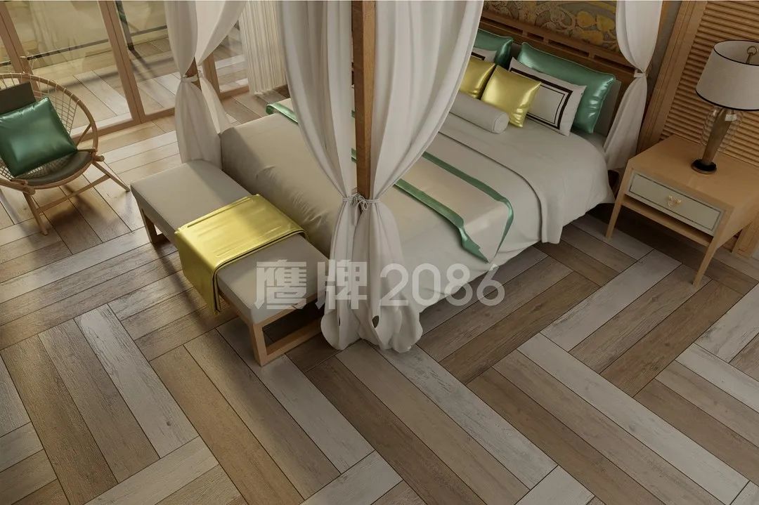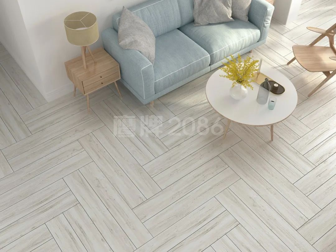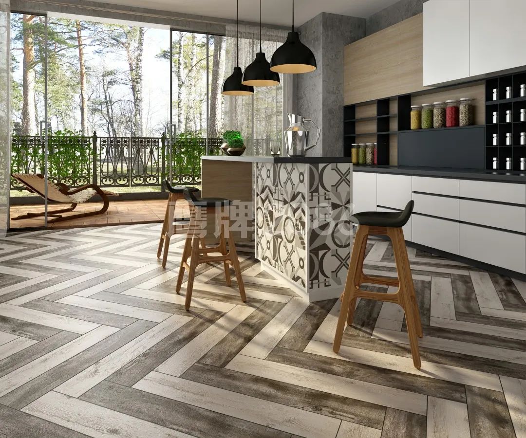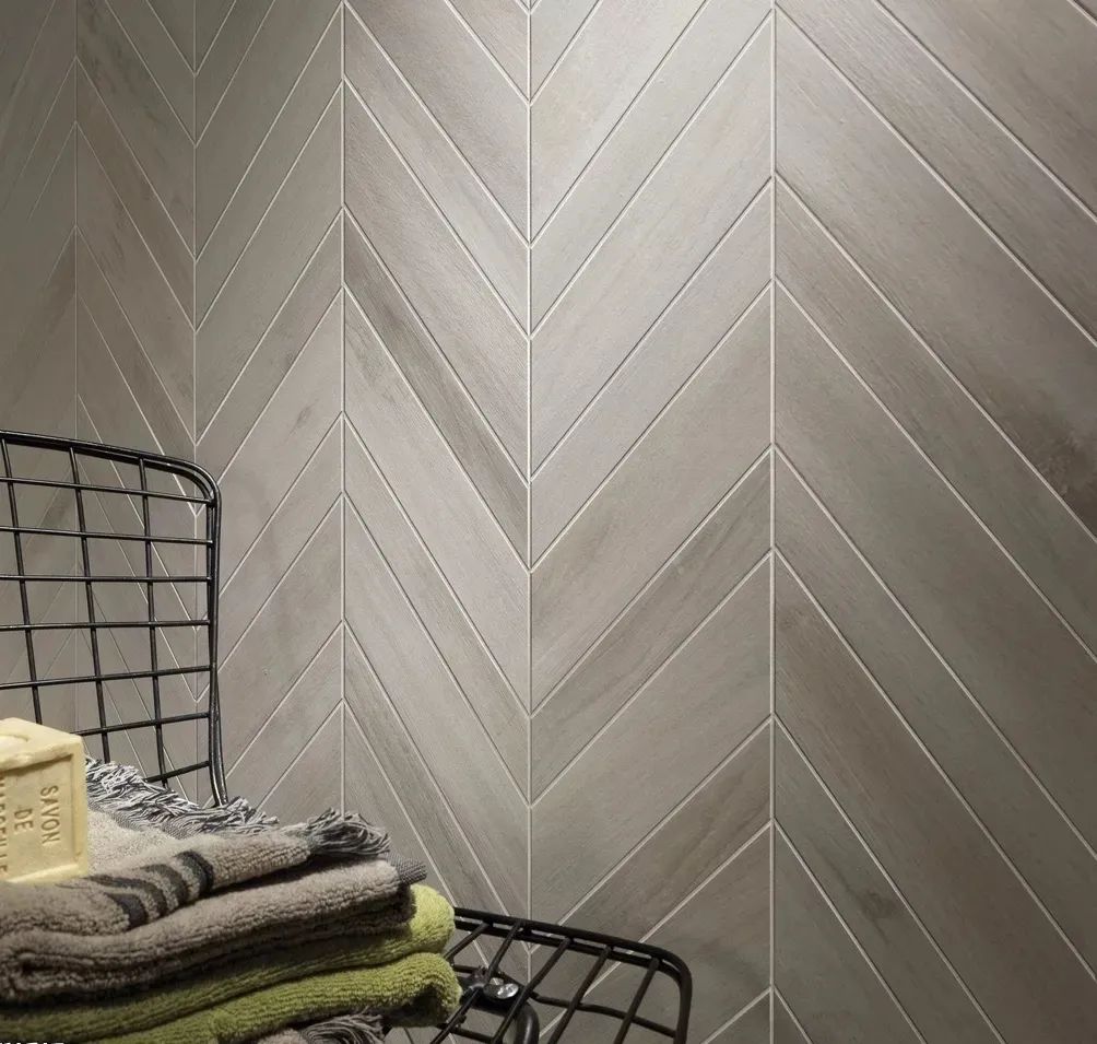 鱼骨铺贴 | 将木纹砖的两边切成60°使得中缝对齐,形成鱼骨般的视觉效果。这种对称的美感,美而不俗,惊艳十足。