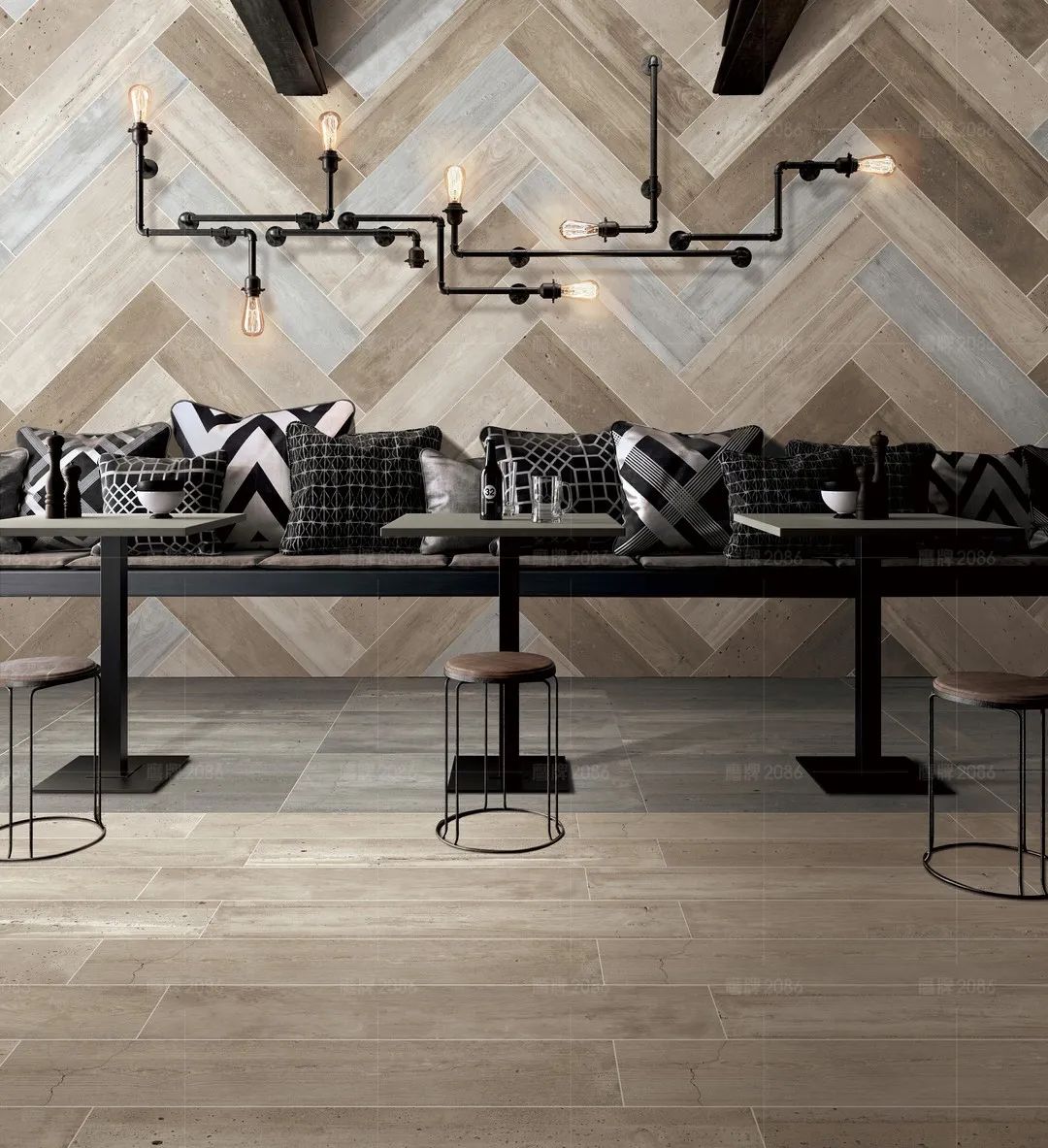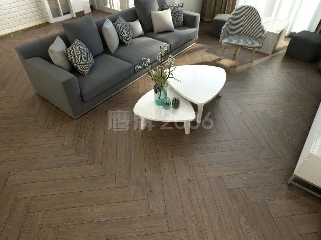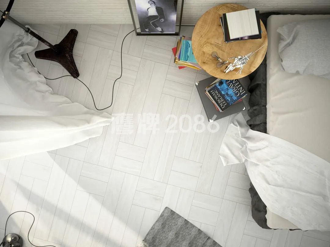 鱼骨铺贴 | 将木纹砖的两边切成60°使得中缝对齐,形成鱼骨般的视觉效果。这种对称的美感,美而不俗,惊艳十足。