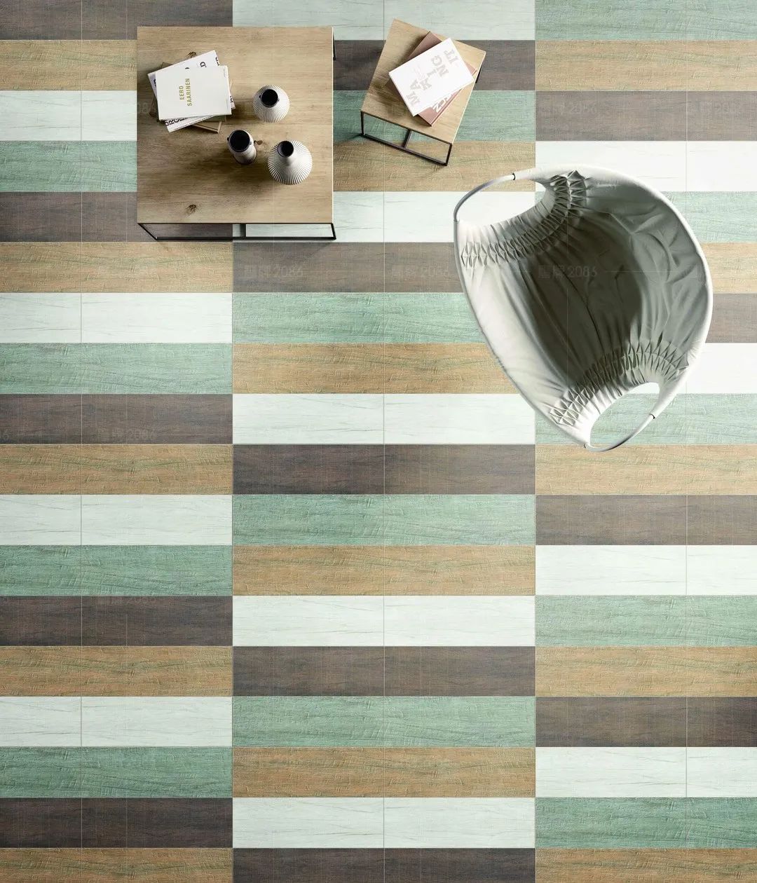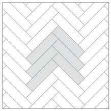 对角铺贴 | 3-5片木纹砖组成正方形块,这些正方形块再以90°对角垂直铺开。