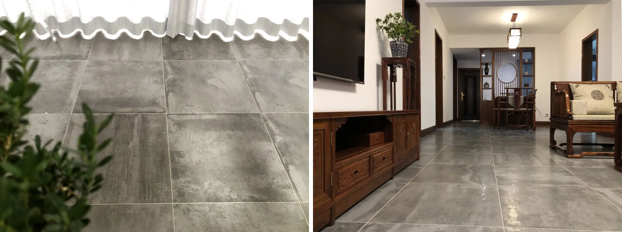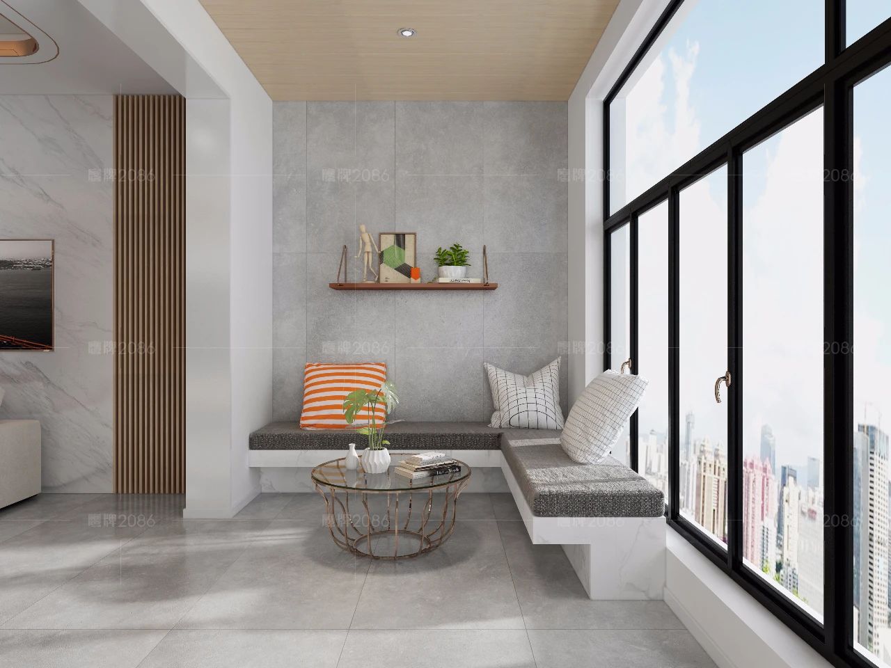 客餐厅运用大面积的简洁灰色调地砖,搭配木色软装装饰,点缀明快鲜艳的橙色,营造家居空间的温暖氛围。