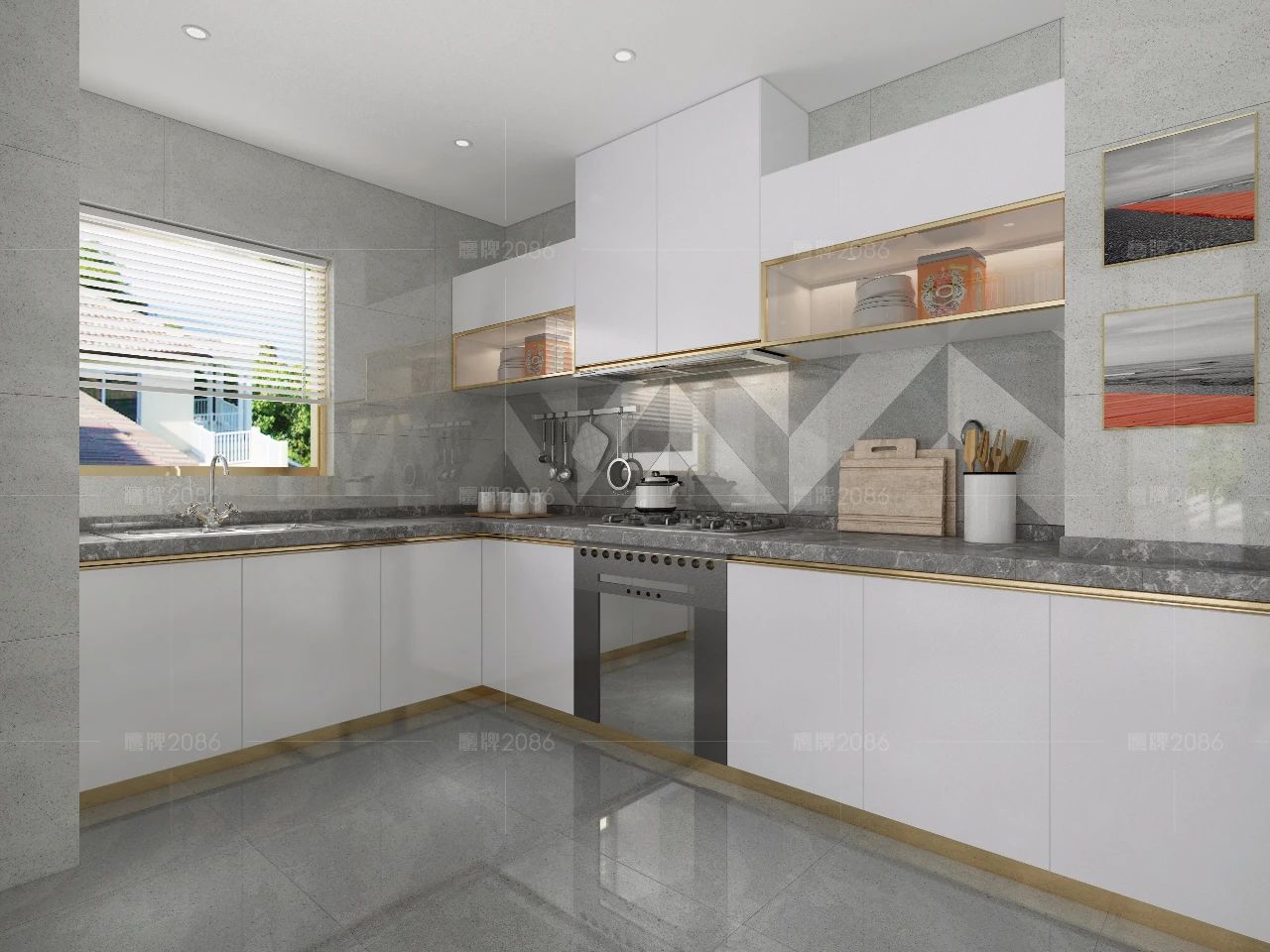 厨房用简约的深浅灰色搭配金属,与大理石台面相呼应,金属质感营造时尚轻奢的空间风格。