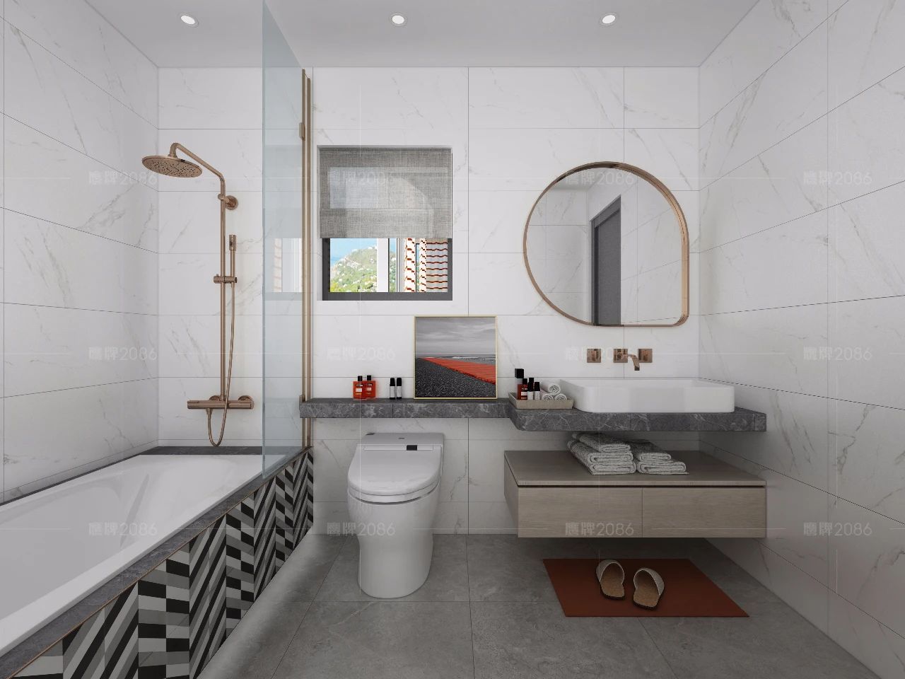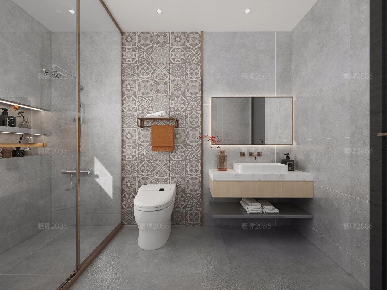 次卫用水墨京砖高级灰打造奢侈感,墙面用切割的水墨京砖和小花砖的搭配,让空间更加灵动,富有层次感。