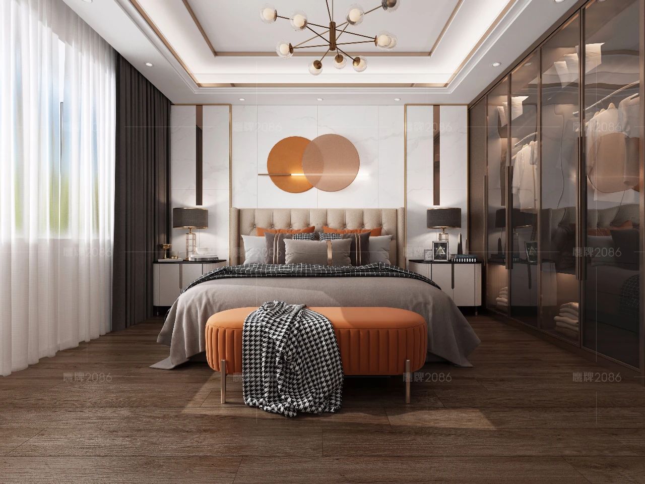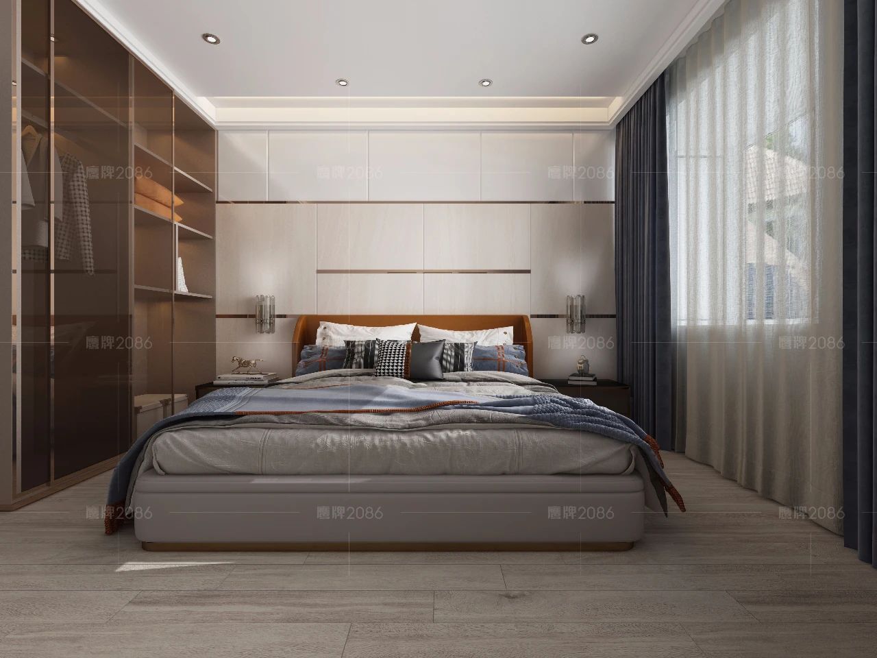 卧室用静谧的高级灰搭配暖黄,木纹砖的自然柔和,玻璃衣柜的简约时尚,处处体现对生活的热爱与品质追求。