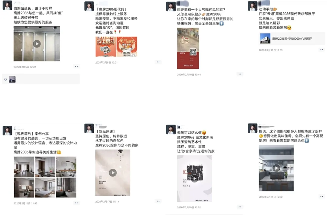 于是沈阳团队配合总部的推广节奏,发出“线上看砖”和“线上设计”的朋友圈动态,同时也融入高质量的设计效果图和实景案例,让“鹰牌2086现代砖”在各自的圈子里收获了一波好感。