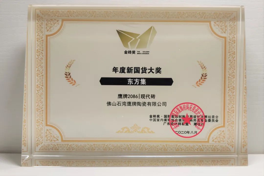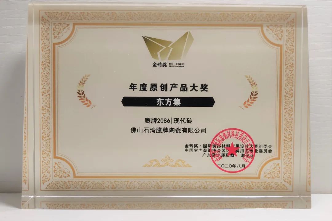 本届金砖奖的宗旨是让更多材料商与优秀的设计师互动,打造更多、更好的装饰材料应用设计案例作品。鹰牌2086凭借原创设计产品「东方集」系列,荣获“年度原创产品大奖”和“年度新国货大奖”两大奖项!