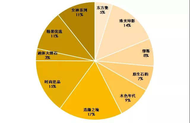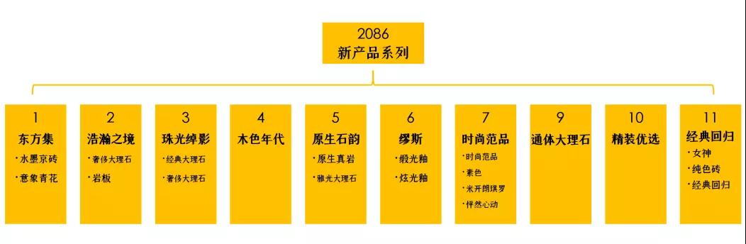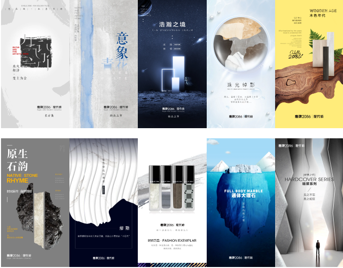 鹰牌2086以领先性原创设计为产品核心竞争力,为市场提供稳定且源源不断的特色产品。在产品系列升级中,除形象产品「东方集」系列(包含“水墨京砖”和“意象青花”两个子系列)外,还有浩瀚之境、珠光绰影、缪斯等共10个大系列,涵盖20多类小系列产品。