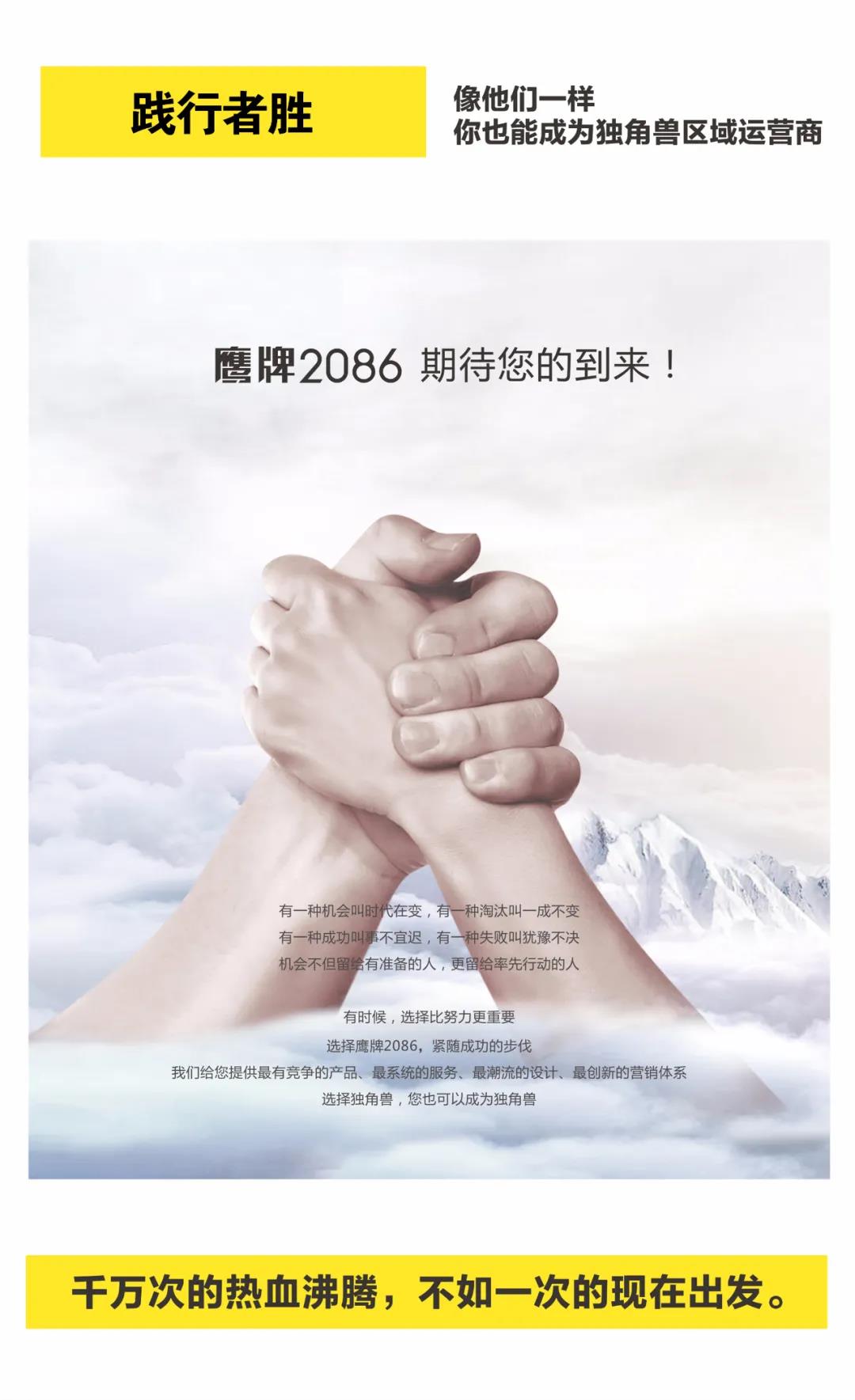 不仅仅是产品,鹰牌2086突破对瓷砖行业产品重、任务重、库存重、投入重等传统印象,化“重”为“轻”,从产品体系、帮扶系统、渠道运营等,全方面多维度服务经销商。5月份,鹰牌2086山东中心仓将重磅揭幕,开启品牌全新阶段战略布局,让现代瓷砖经销商灵活经营,“轻”松盈利。