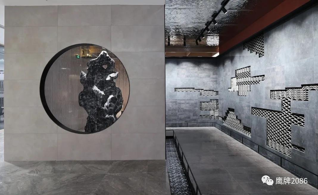 另一个入口运用苏式造景的手法设计,圆窗、水帘、太湖石、与主入口相呼应的瓦片……行走其中,好像置身于苏州园林。与其他空间不同的是,在这里可以拍摄出宛如江南女子的柔美风情。