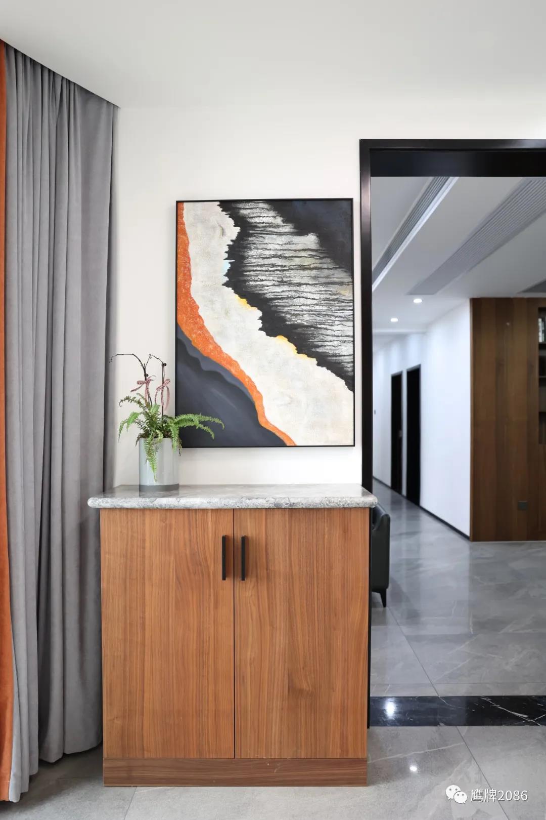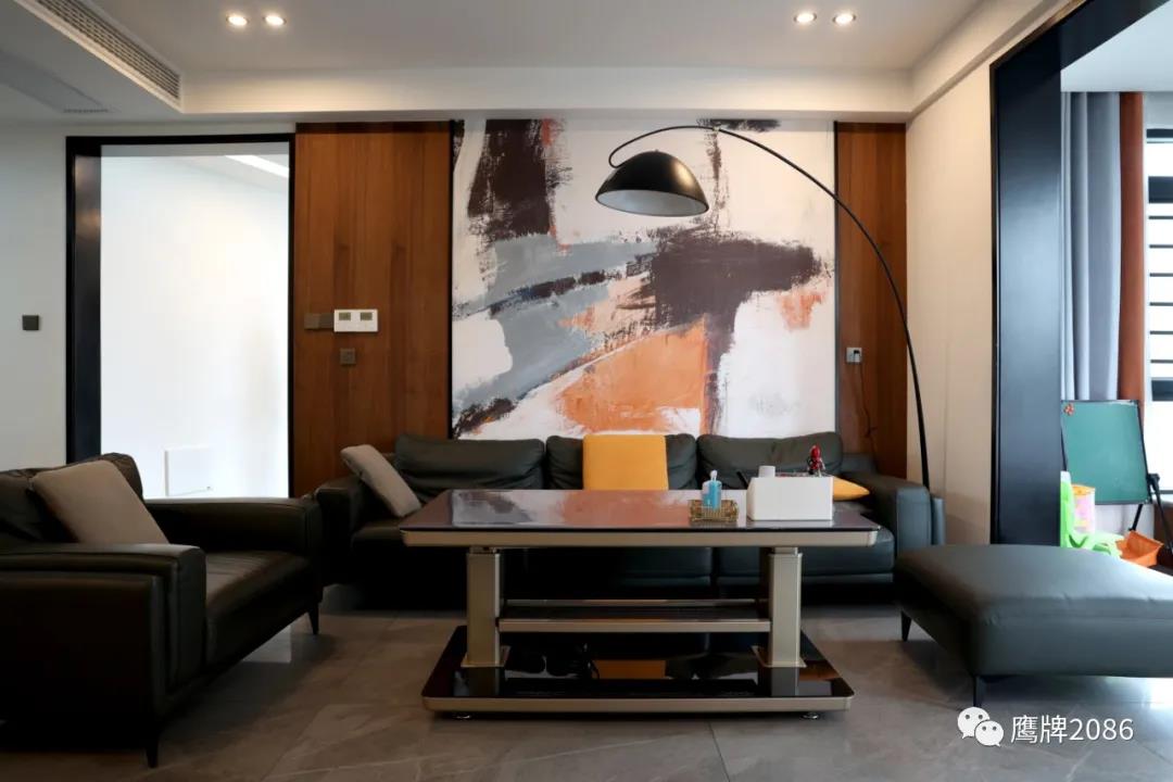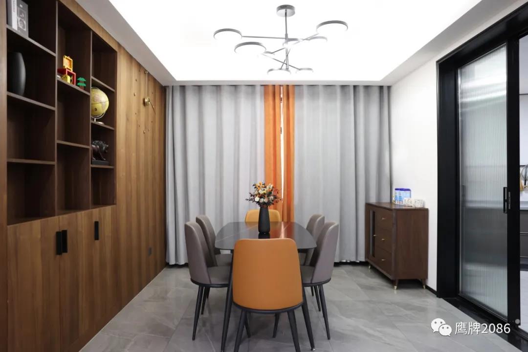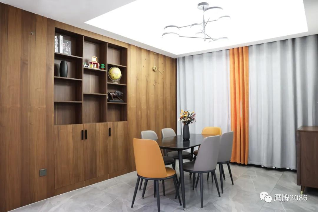 入户玄关和客餐厅用灰色系瓷砖大面积通铺,600*1200mm规格大气修长,大理石纹理经典时尚,客餐厅搭配木色柜体、皮质沙发、橘黄色系布艺、艺术装饰画......功能性与装饰性和谐统一,简约又富有青春活力。