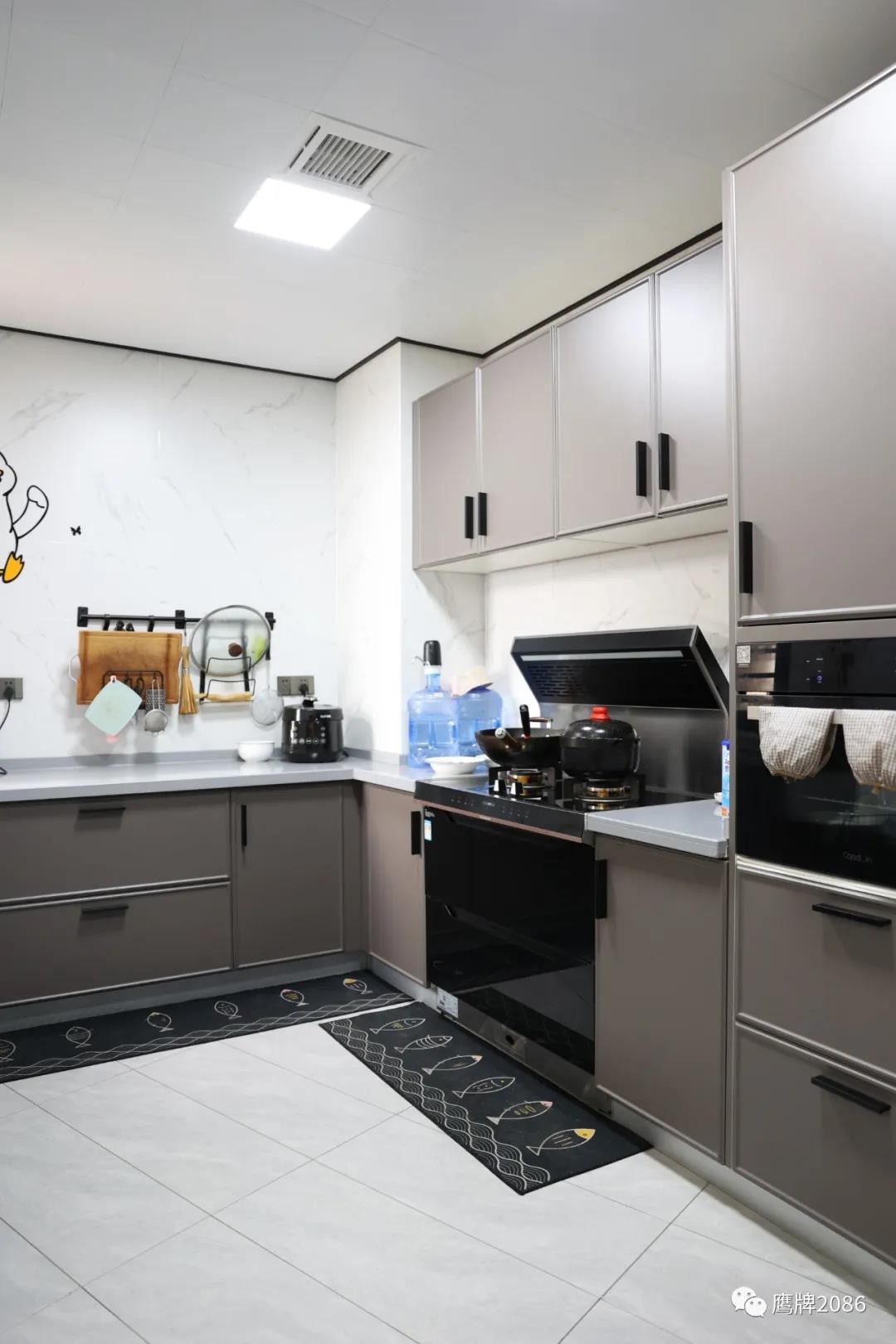 厨房地面是浅灰色瓷砖,墙面是白色大理石纹瓷砖,搭配灰色简约橱柜,干净的直线设计,让厨房收纳整洁有序。