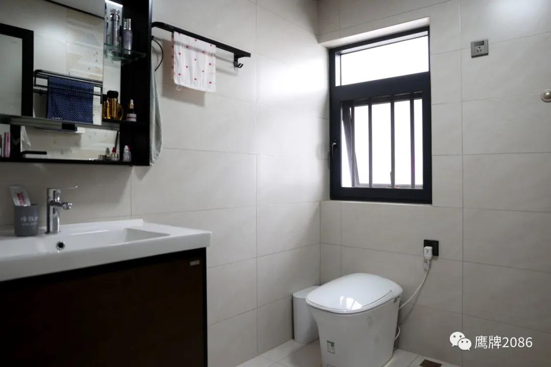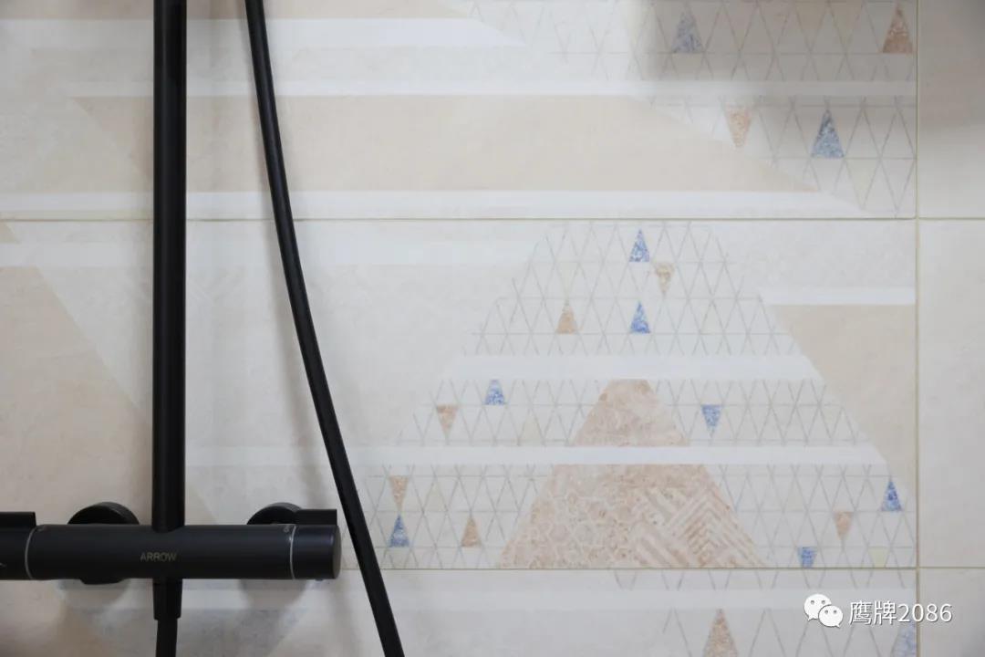 卫浴间用深浅不同的灰色系瓷砖,满足卫浴间干净整洁易打扫的需求。壁挂式洗手台,便于打扫与收纳。淋浴房用暖黄色系,跳跃的几何色彩,为素雅的卫浴间增添一抹生机和趣味。