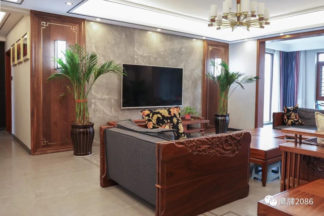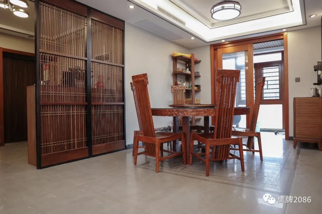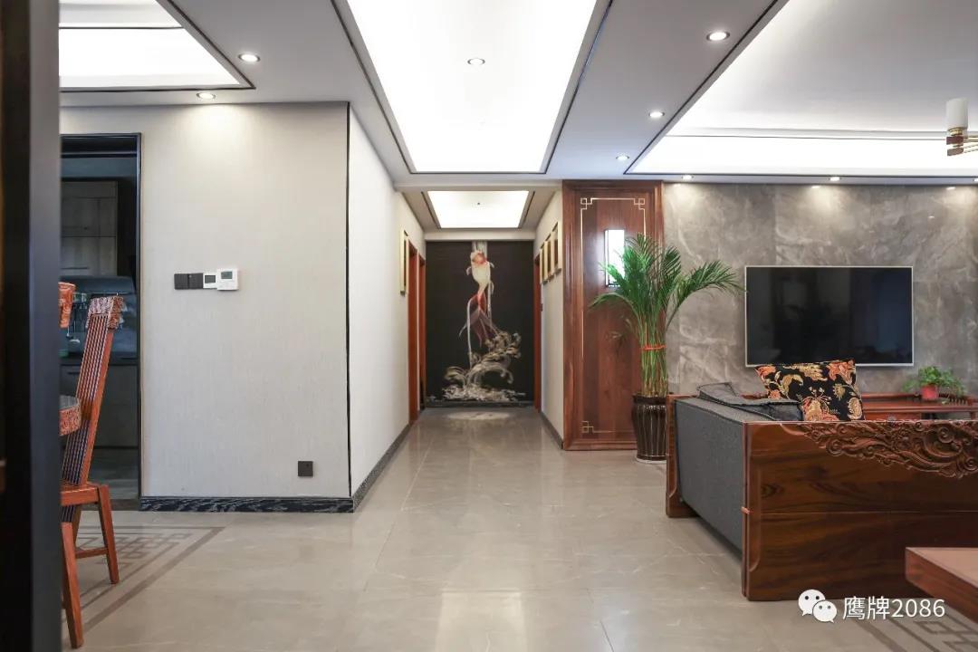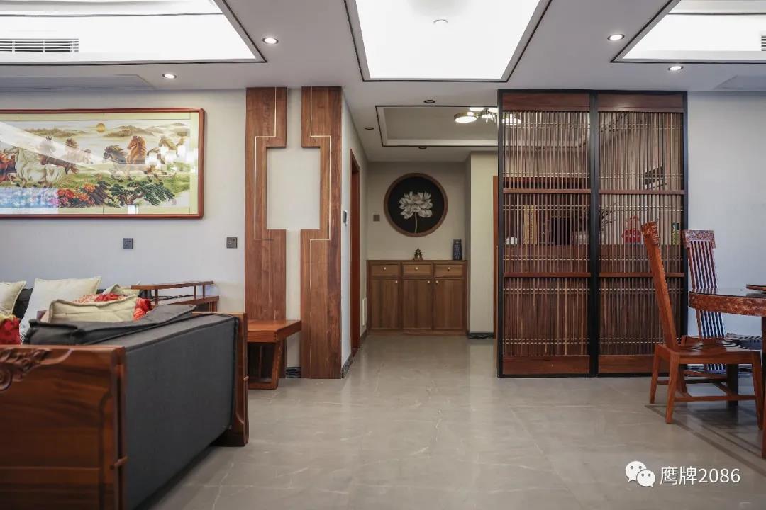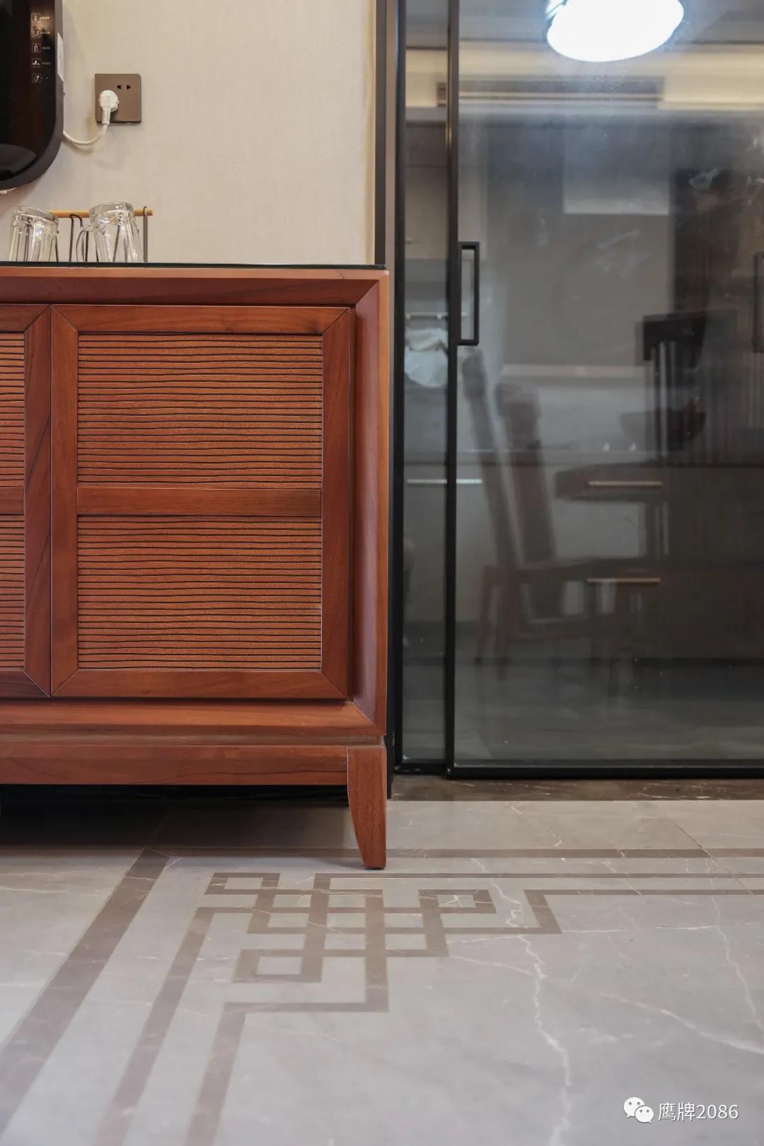 客厅和餐厅用同款不同色系的产品做拼花设计,规整有序,简约版中国结纹样呼应整体空间风格。