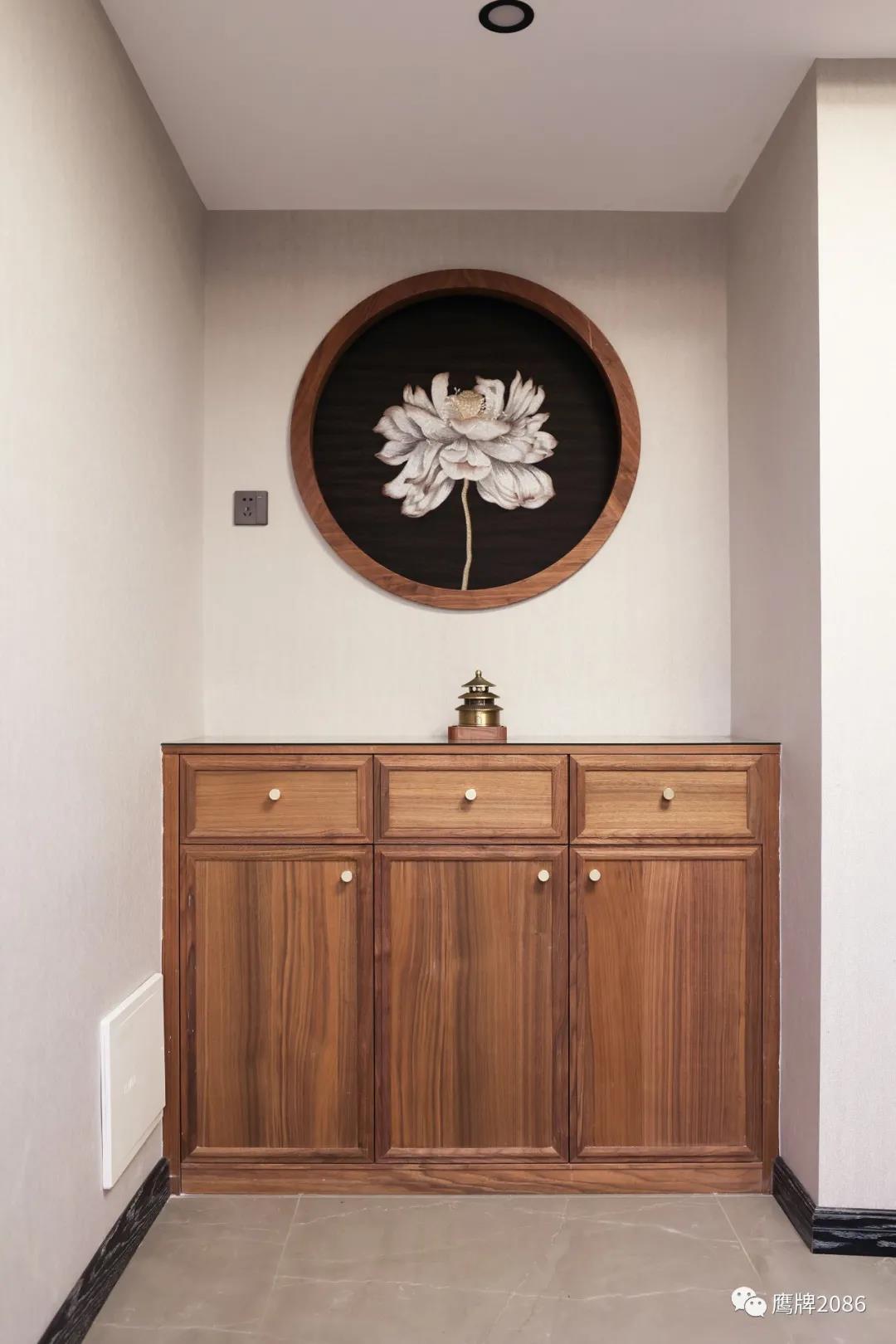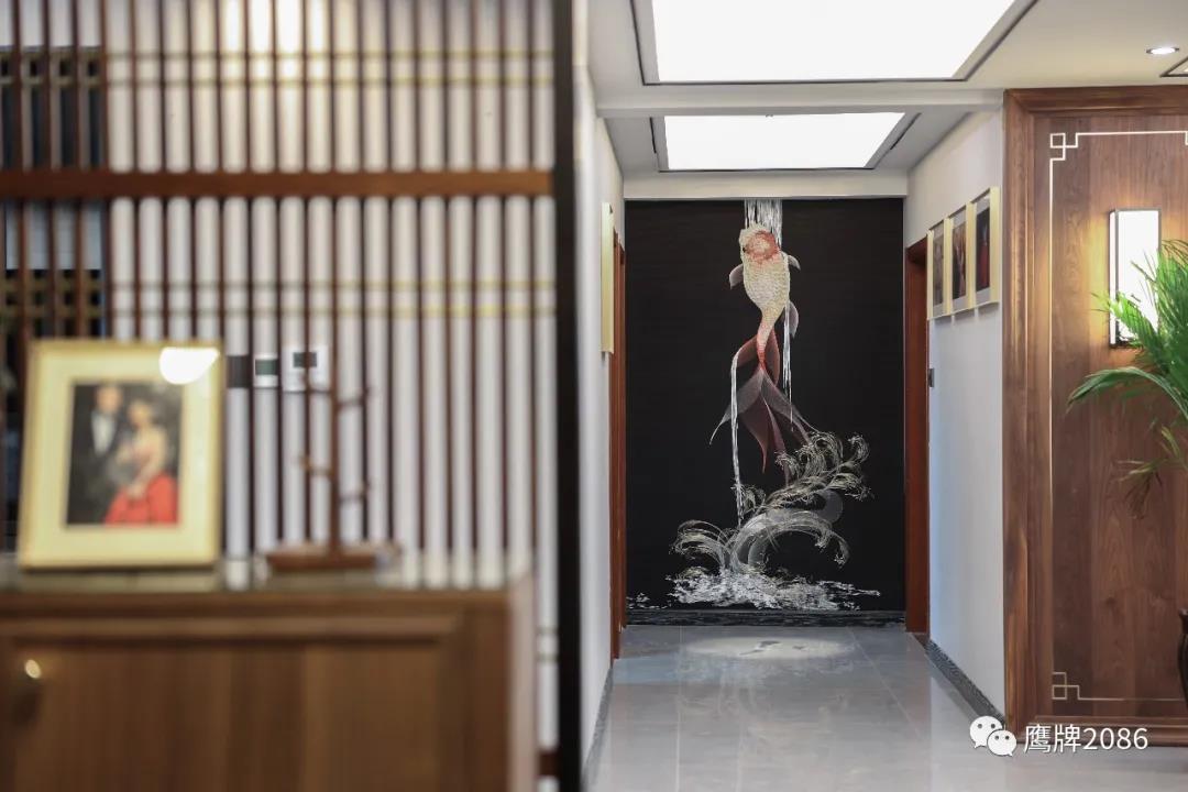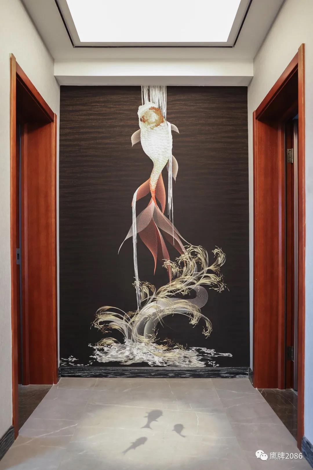 玄关的刺绣荷花和走廊的刺绣锦鲤,中国传统文化与现代家居的完美融合,也彰显业主对新生活的美好期待与热爱。