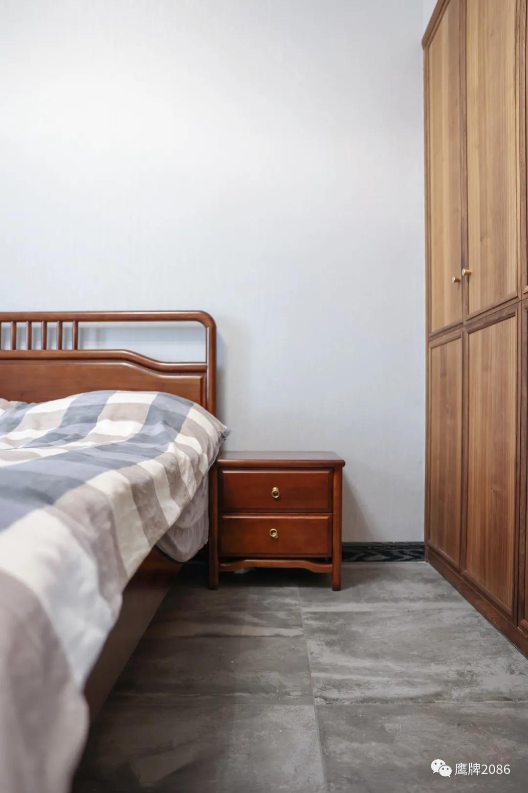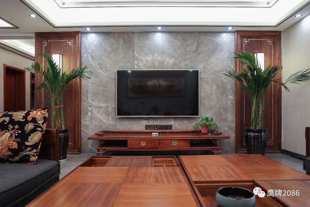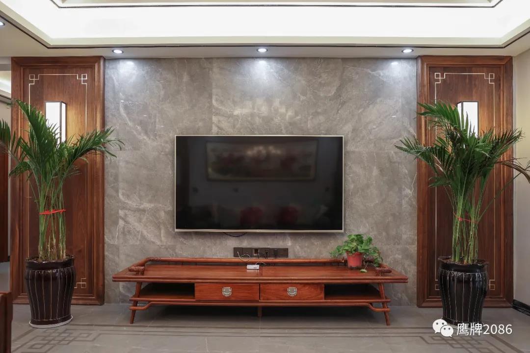 电视背景墙用灰色大理石瓷砖和原木材料做中式对称设计,简约的几何方形壁灯,长条多格实木电视柜,传达中国对称美。卫浴间墙面用大理石纹瓷砖,低调简约,又不失现代时尚感。