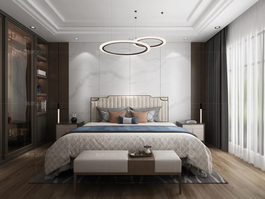 卧室设计以简洁为宜,简化空间的装饰,地面选用木纹砖带来自然气息。低光感度的岩板上墙,降低视觉压力,营造和谐静谧的睡眠环境。