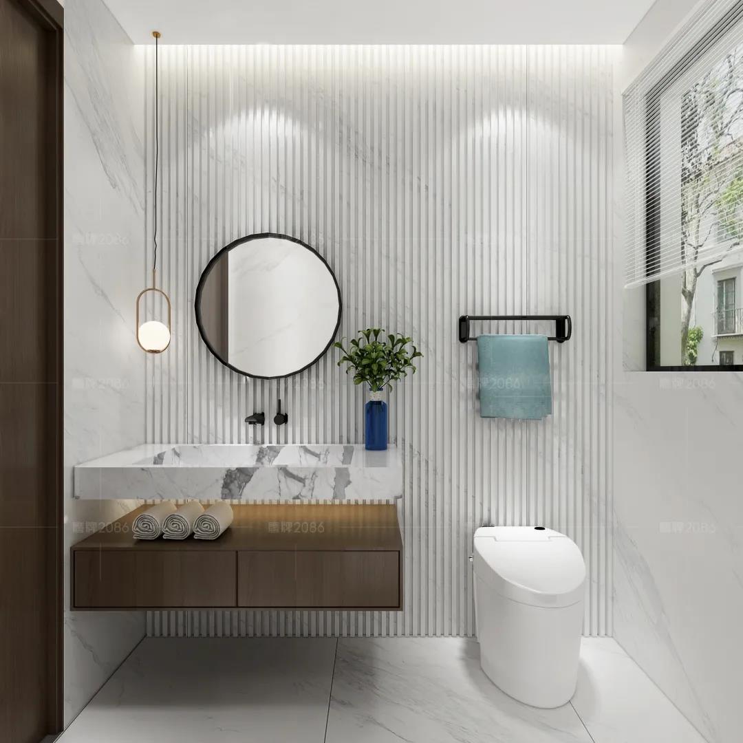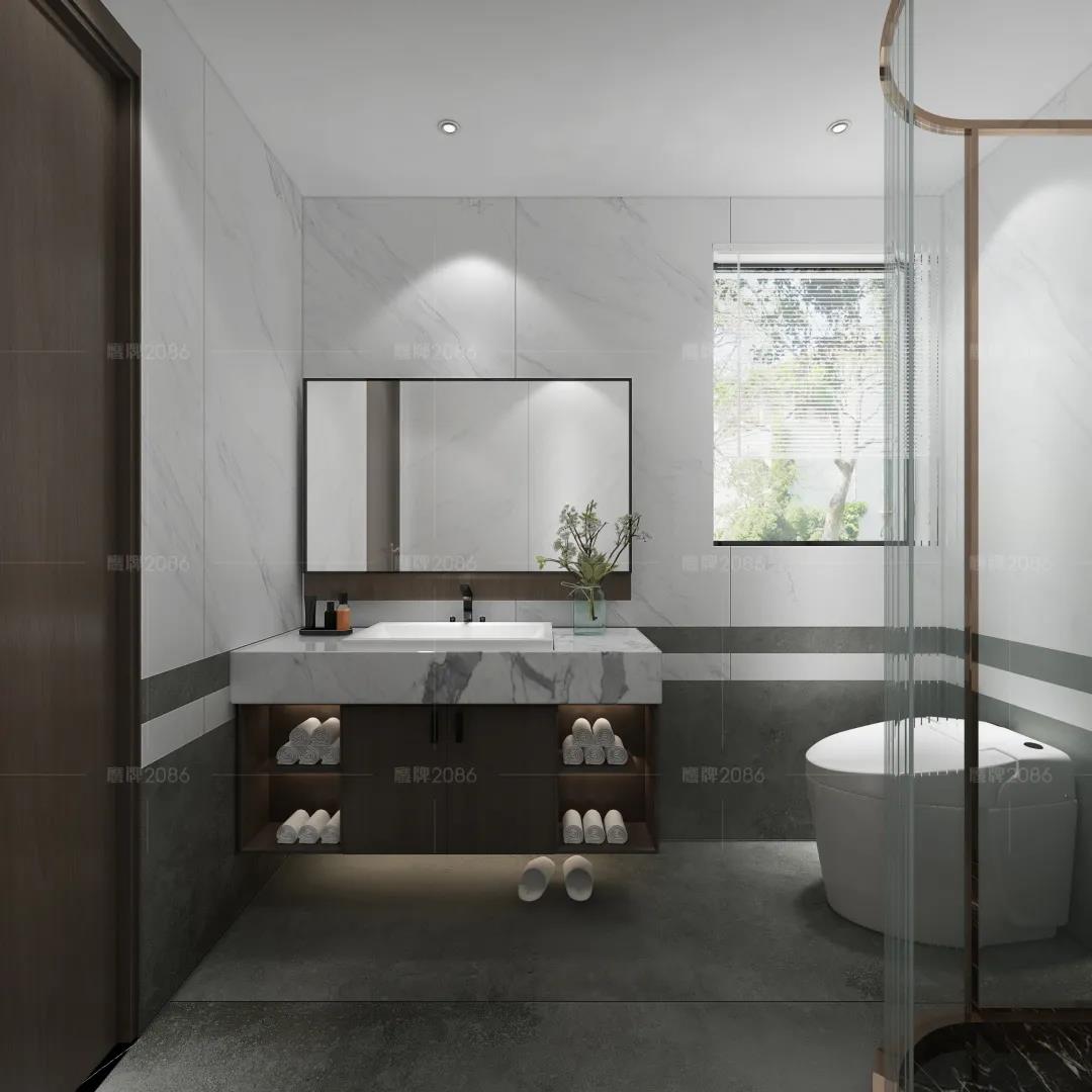 两个卫浴空间均采用悬挂式柜体,更节省空间也更符合现代美感。800×2600mm岩板可塑性强,品质优异,上墙下地、切割拉槽随心所欲,让平面变得立体化,让空间更有独特性。