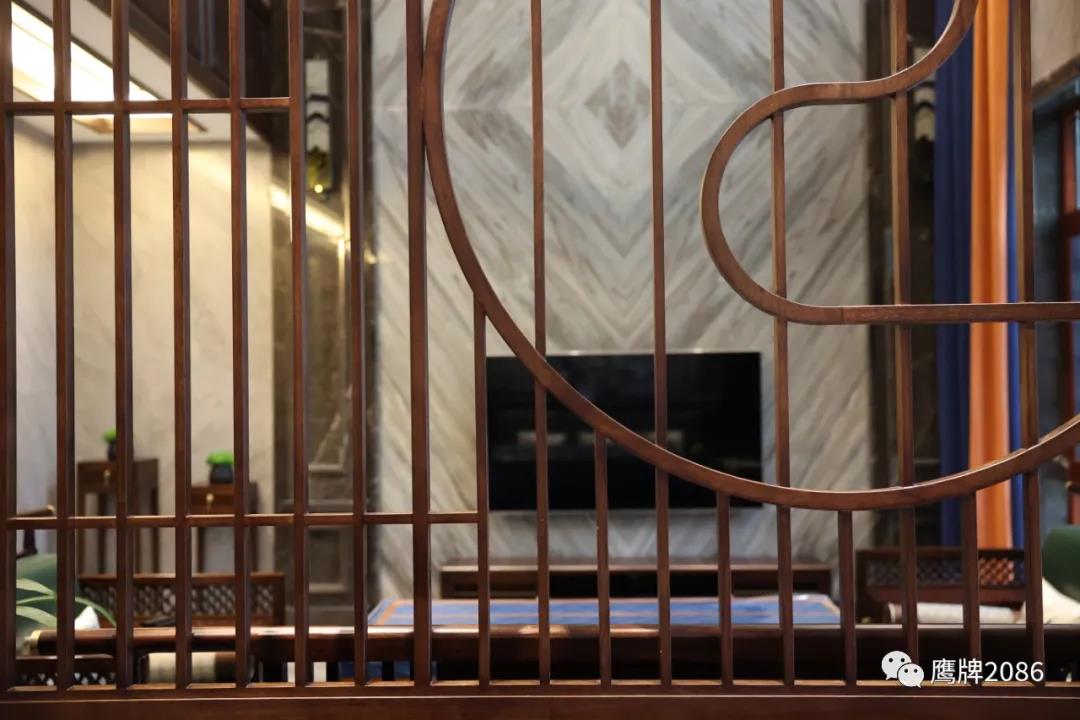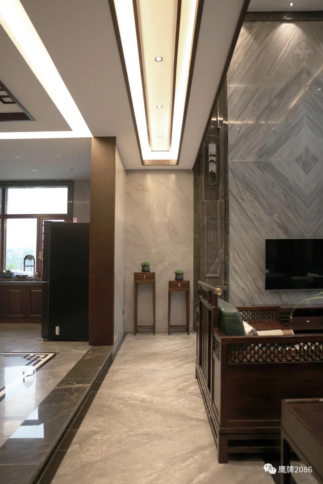 入门玄关处通过木屏风隔断可以看到客厅,视野通透,客厅做了挑高设计,通铺750×1500mm浩瀚之境大规格产品,彰显大气磅礴的空间感。