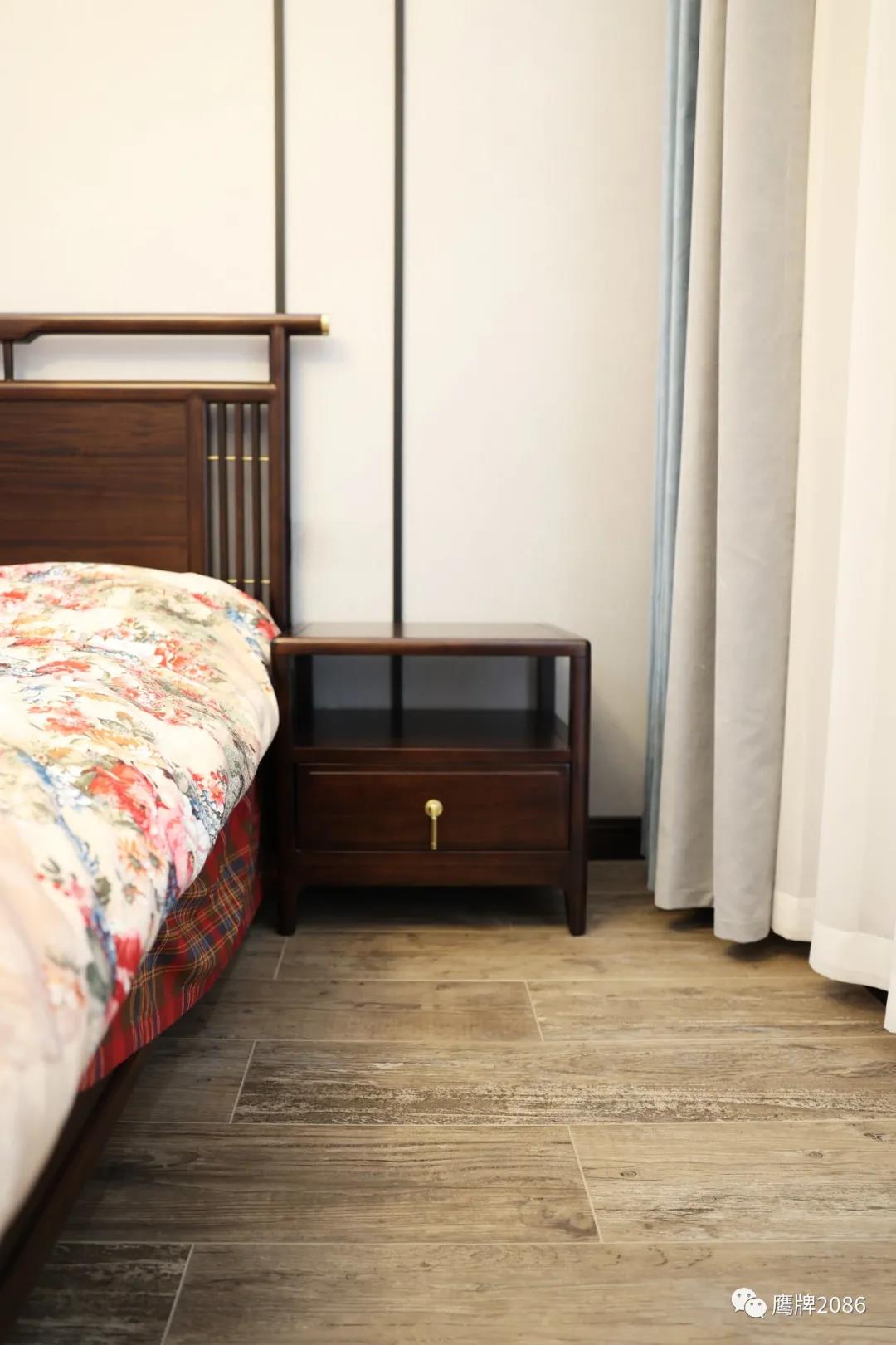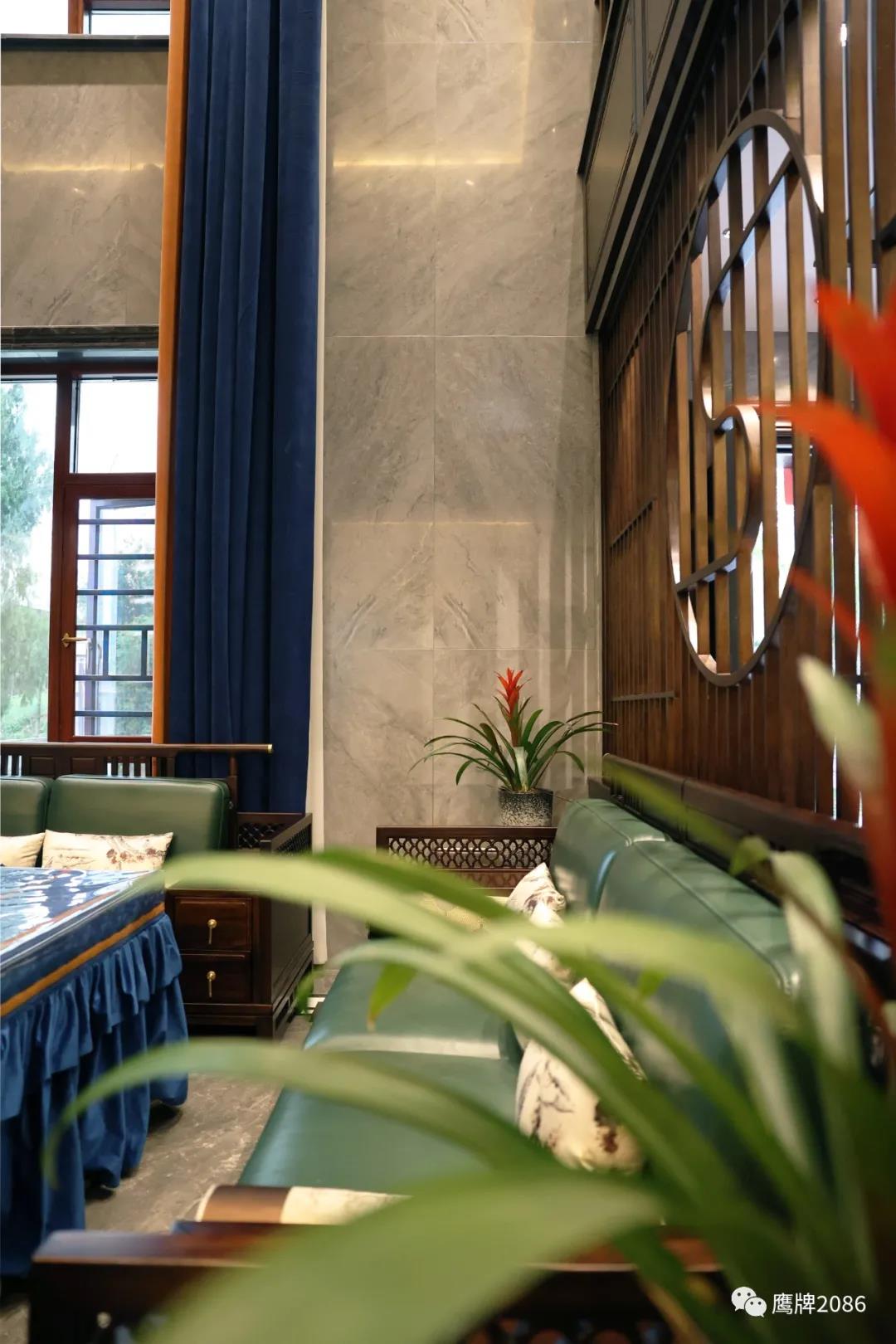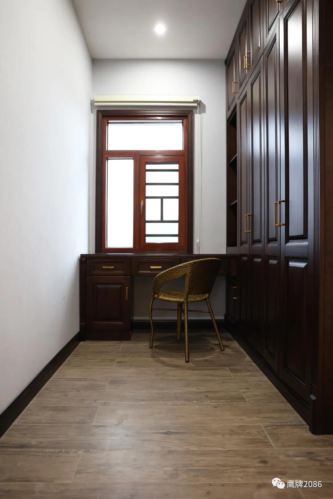 二楼主要是用水墨京砖系列打造的客厅、茶室、阳台等空间,温润儒雅,增添一份人文气息;木色年代系列木纹砖营造温馨舒适的卧室和衣帽间,摆脱繁杂喧闹,回归悠闲安静的休憩空间。
