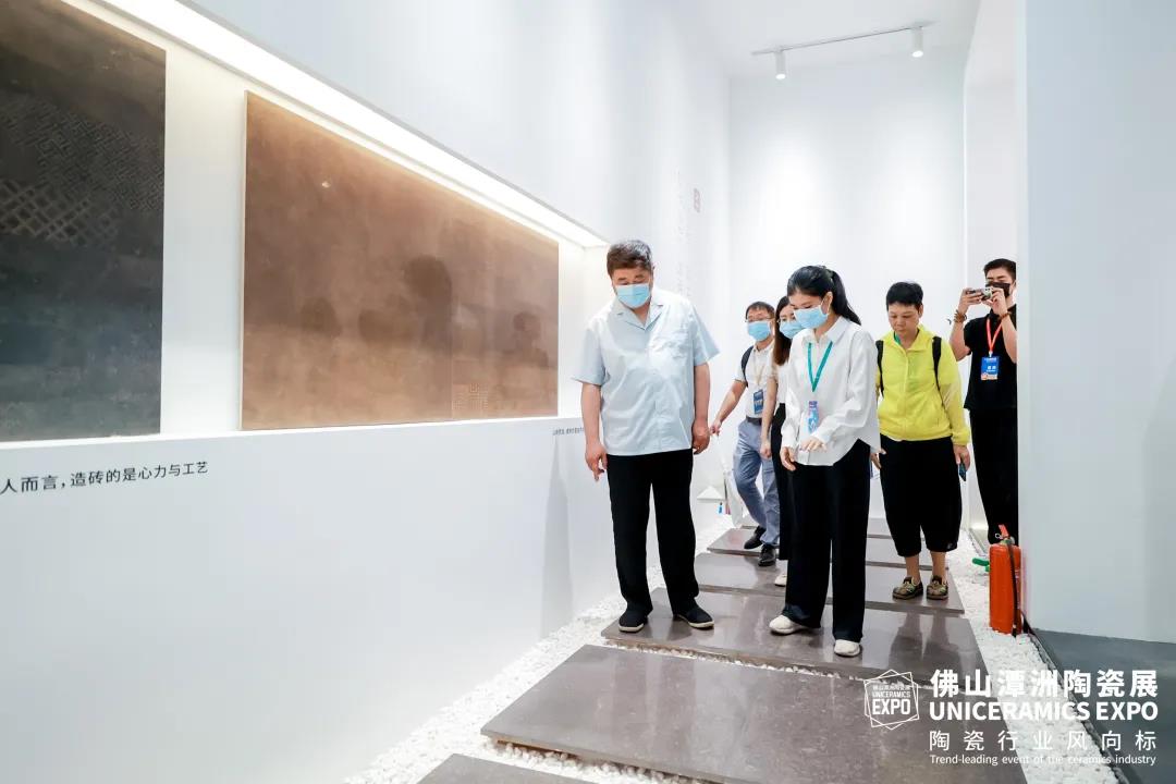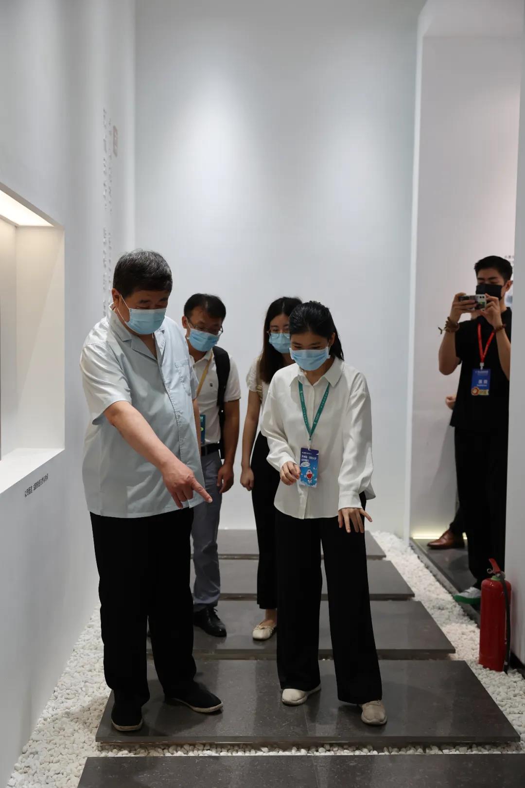 ▲7月24日上午,单霁翔院长第二次前往鹰牌2086展位进行参观,对展示的水墨京砖等系列产品表达了喜爱。他走过由水墨京砖铺设的过道,听到产品设计灵感来自故宫金砖,便仔细端详了一番,还开玩笑说:“这个薄一点,故宫的厚。”