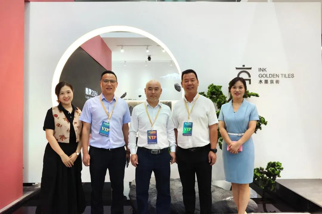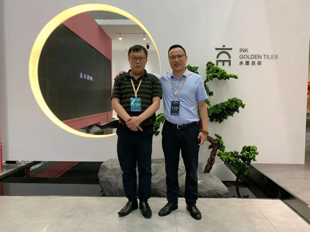 ▲景德镇陶瓷大学副校长吕品昌(主持工作)与广东鹰牌陶瓷集团总裁林伟莅临展位