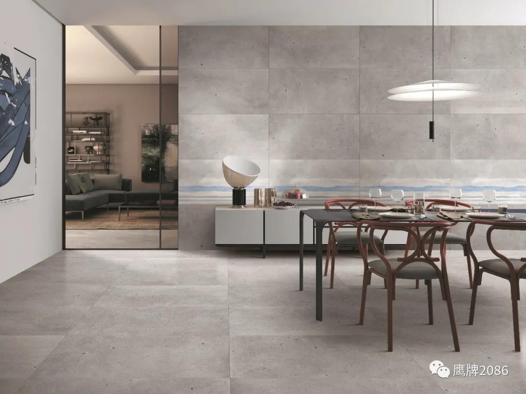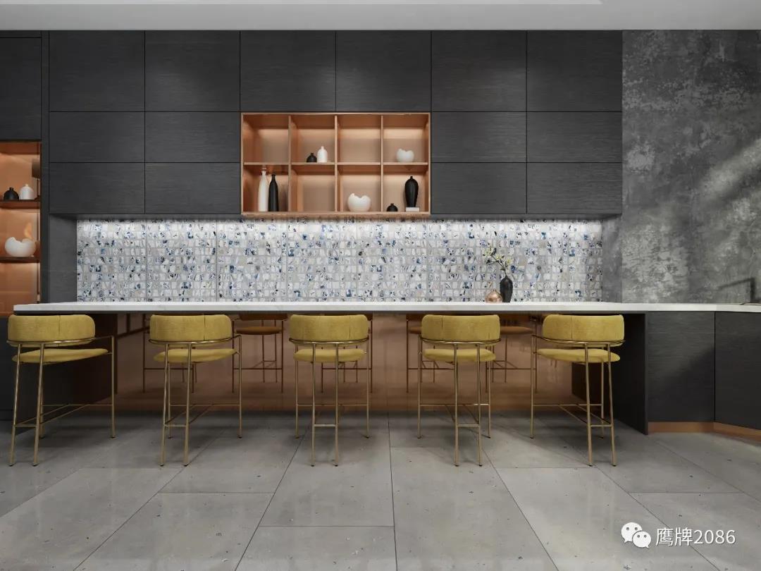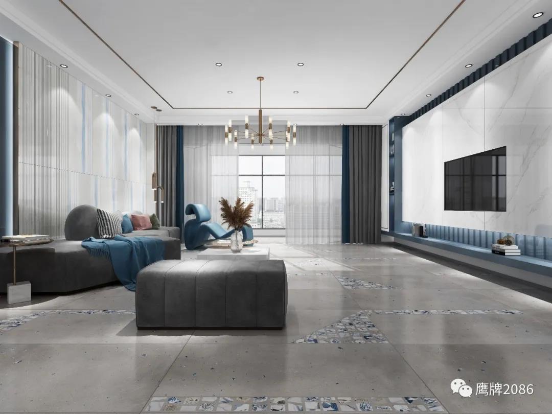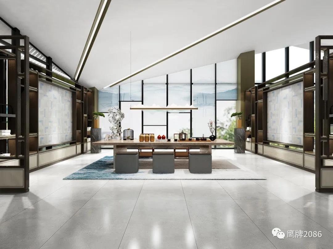 正如陶瓷一线品牌鹰牌2086东方集系列,也是对传统文化的传承和创新,除了形象产品“水墨京砖”之外,还有“意象青花”。虽是以青花瓷作为设计灵感,却没有直接沿用青花瓷的象征性纹样,而是提炼了青花瓷的颜色,青花瓷的碎片,将中国传统文化与现代设计美学进行融合重组,演绎出有文化、有故事、有温度的空间面料,传达符合时代审美的中国传统文化之美。