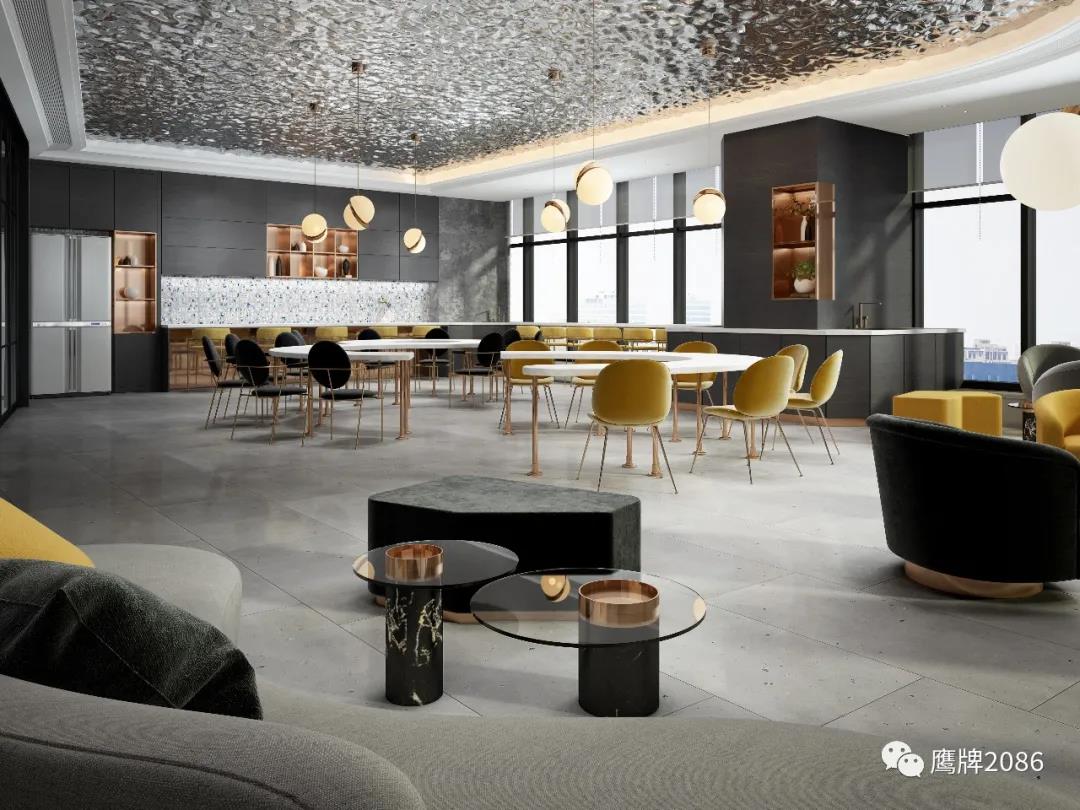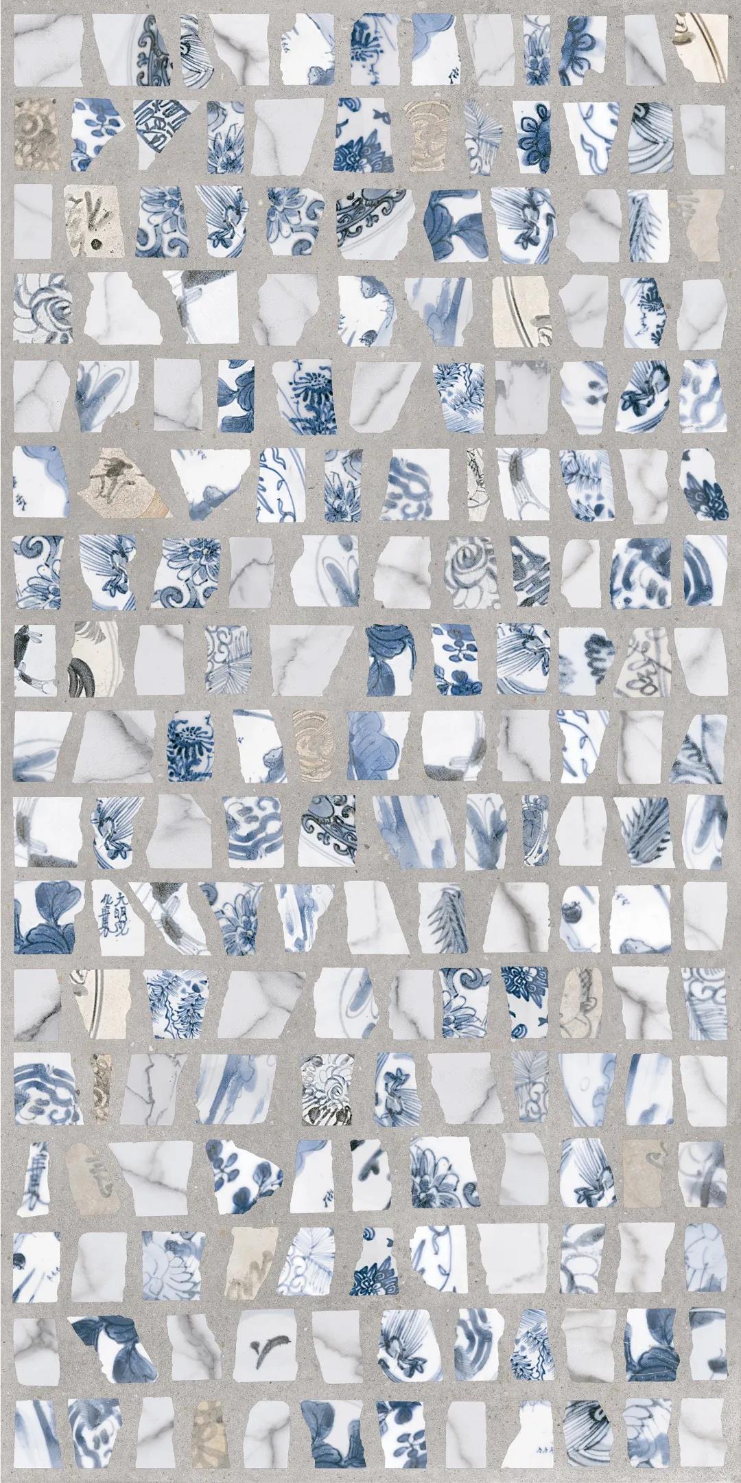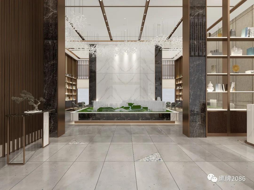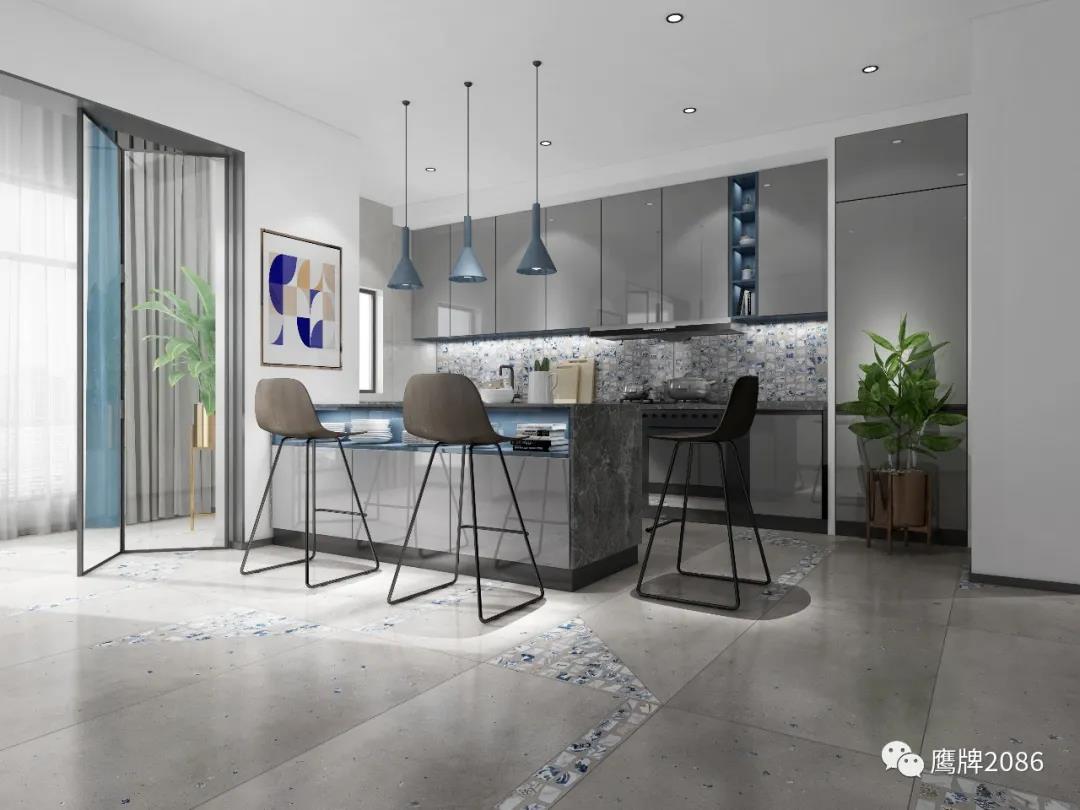 正如陶瓷一线品牌鹰牌2086东方集系列,也是对传统文化的传承和创新,除了形象产品“水墨京砖”之外,还有“意象青花”。虽是以青花瓷作为设计灵感,却没有直接沿用青花瓷的象征性纹样,而是提炼了青花瓷的颜色,青花瓷的碎片,将中国传统文化与现代设计美学进行融合重组,演绎出有文化、有故事、有温度的空间面料,传达符合时代审美的中国传统文化之美。