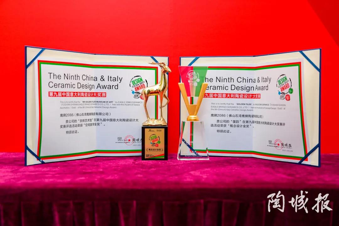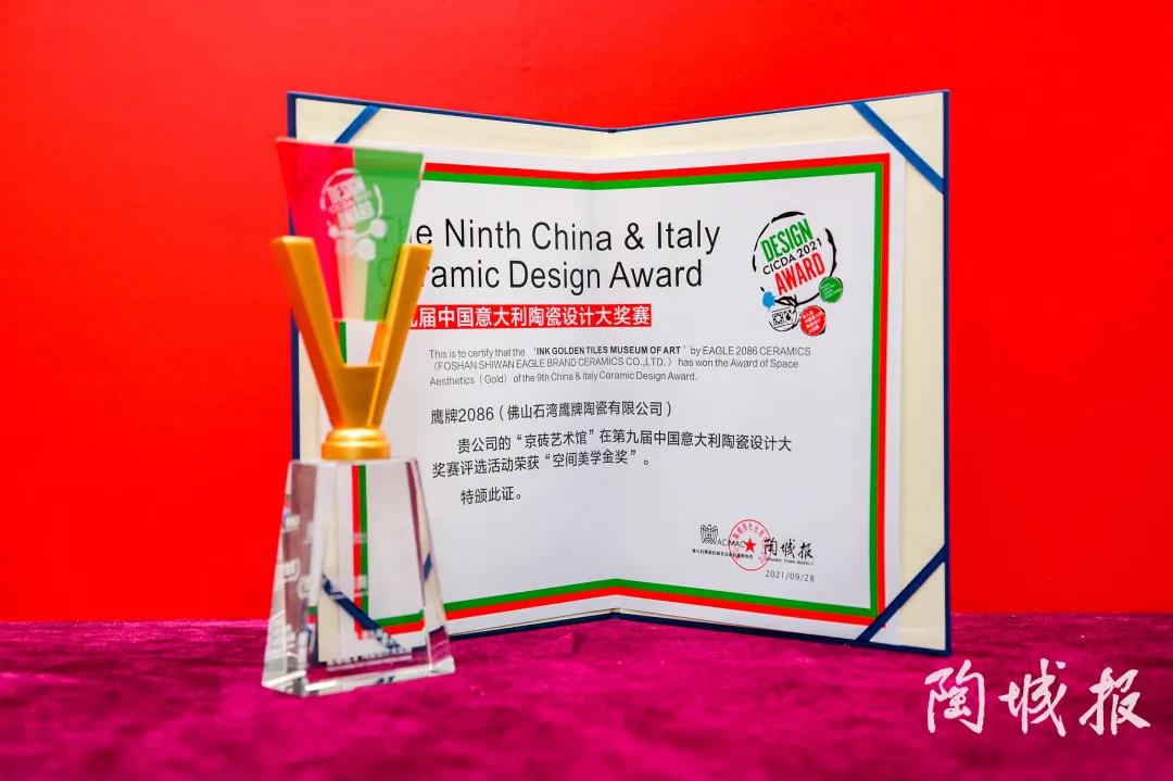 陶瓷一线品牌鹰牌2086凭借“京砖艺术馆”和“墨韵”概念产品荣获第九届中国意大利陶瓷设计大奖赛“空间美学金奖”和“概念设计金奖”两项重量级奖项!