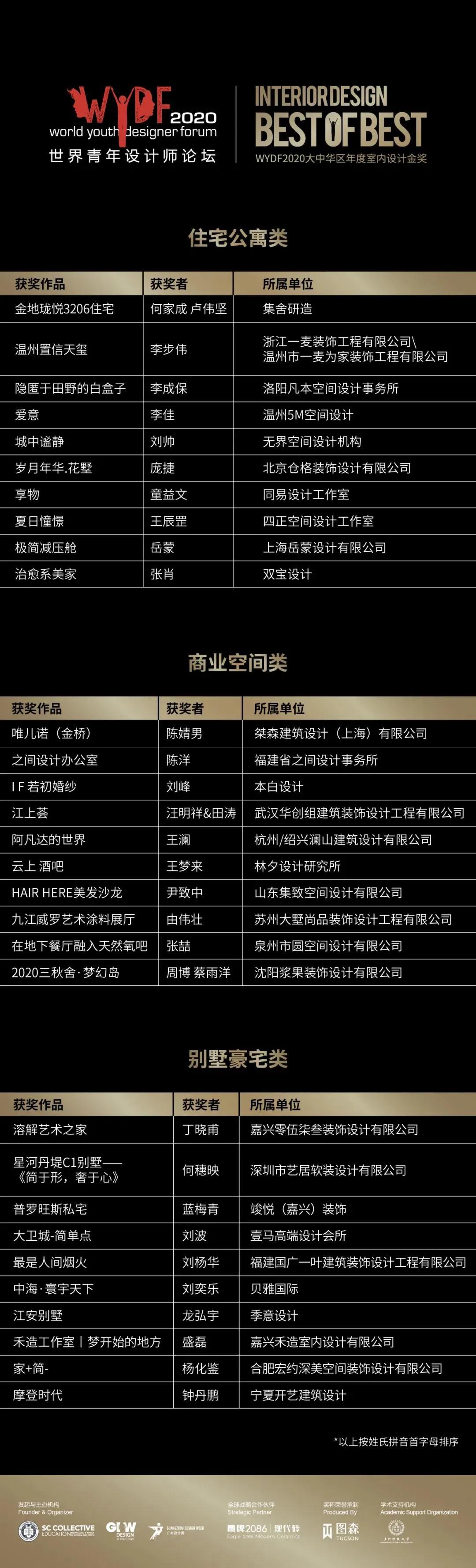 经过大中华区组委会的严格审核,最终从所收到的所有作品中遴选出30套优秀的住宅公寓、别墅豪宅、商业空间设计作品,荣获本年度室内设计金奖。