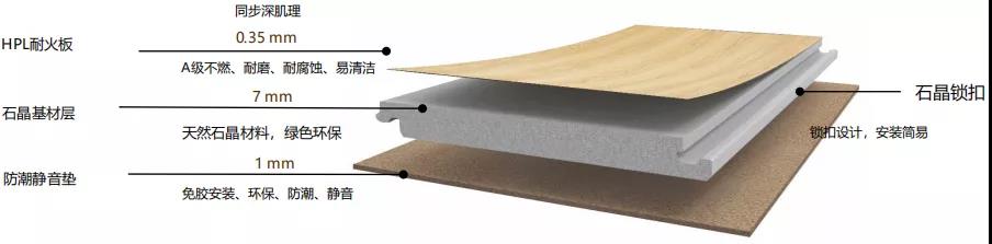 石晶即天然石粉和环保树脂复合材料。以环保石粉和树脂为原材料,石粉即将岩石粉碎成粉,树脂则属于人工合成材料,取材皆不会破坏自然环境,两者搅拌均匀后再经高温挤压制成复合板材。石晶基材在制作过程中不用胶水,所以不含甲醛、苯等有害物质,是真正的0甲醛绿色环保地板。