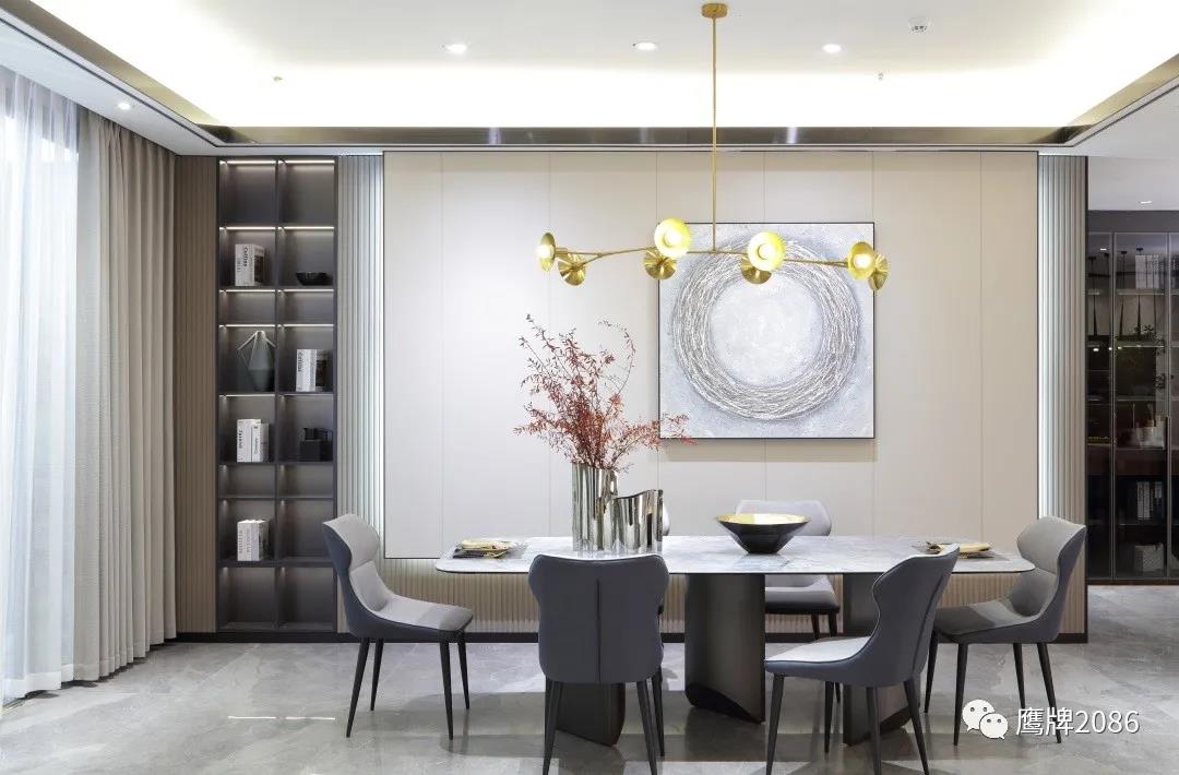 本案全屋设计从健康美居出发,除了选用鹰牌2086现代砖之外,还应用了鹰牌2086墙地专家新上市的产品——板装配式护墙板和石晶地板,打破单一材料售卖的局限性,实现整装高定快速交付,为消费者提供所见即所得的一站式家装设计服务。