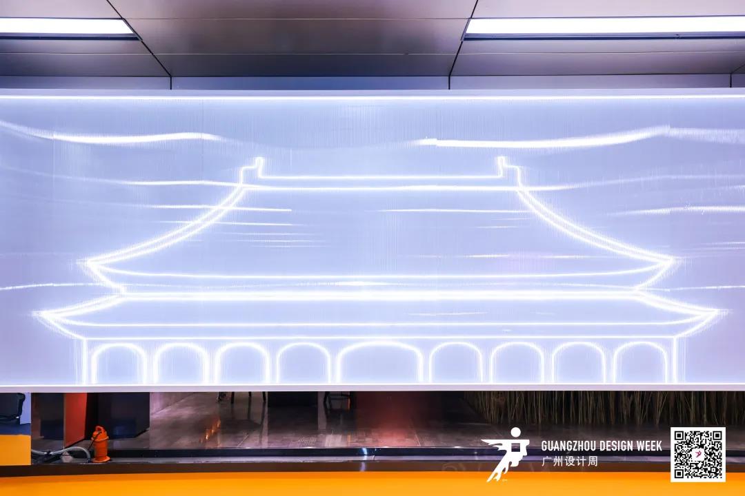 水墨京砖馆外观像一座大山,山脚下水流成溪,白色灯带的科技感与室内环境的神秘感形成对比,若隐若现的世外桃源,留一小口,引观众踏入向往的诗意生活。
