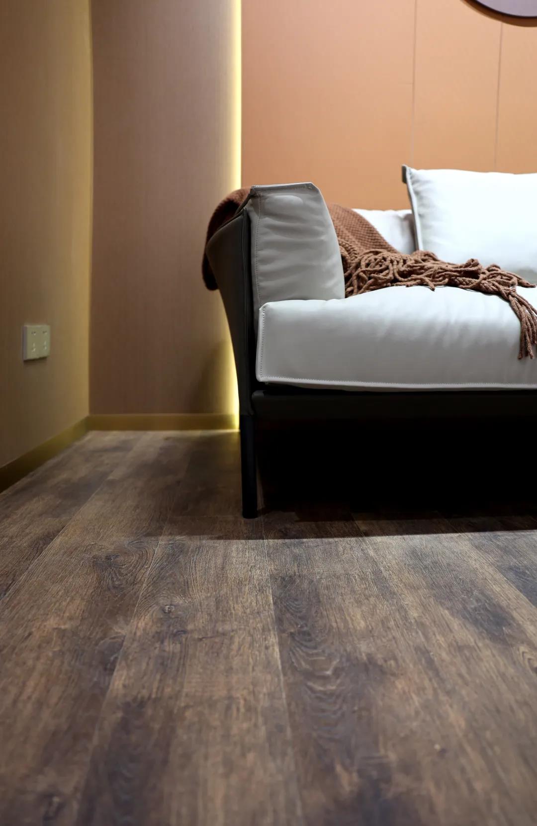 地面则是HPL石晶地板,作为新型防火装饰材料,HPL石晶地板由高科技防水无醛石晶基材及HPL防火板与饰面层组合而成,是国内首款原创、具有超高装饰及物理性能的新型防火地面装饰材料,拥有阻燃、耐磨、耐烟头烫伤和耐刻划等性能。
